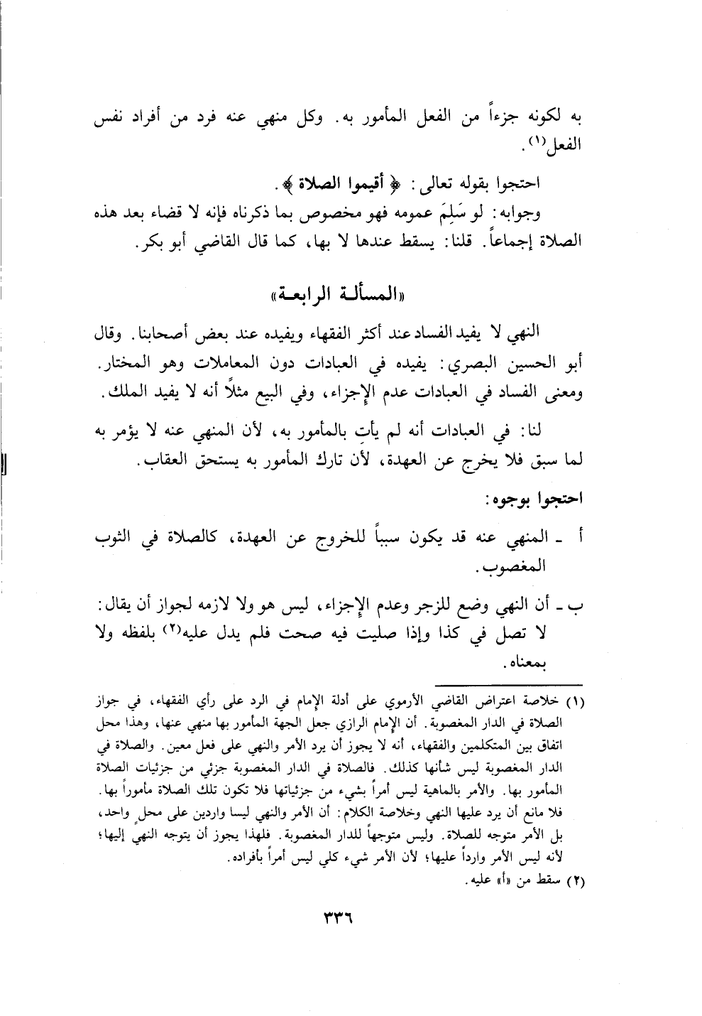 (١) خلاصة اعتراض القاضي الأرموي على أدلة الإِمام في الرد على رأي الفقهاء، في جواز الصلاة في الدار المغصوبة. أن الإمام الرازي جعل الجهة المأمور بها منهي عنها، وهذا محل اتفاق بين المتكلمين والفقهاء، أنَّه لا يجوز أن يرد الأمر والنهي على فعل معين. والصلاة في الدار المغصوبة ليس شأنها كذلك. فالصلاة في الدار المغصوبة جزئي من جزئيات الصلاة المأمور بها. والأمر بالماهية ليس أمرًا بشيء من جزئياتها فلا تكون تلك الصلاة مأمورًا بها.