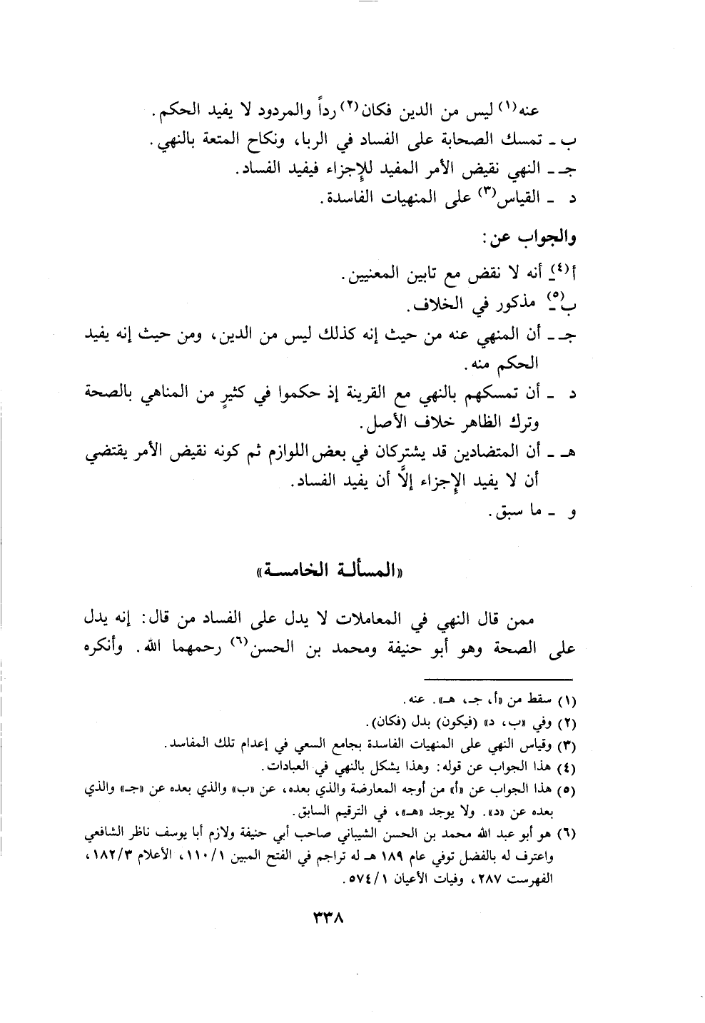 (٥) هذا الجواب عن "أ، من أوجه المعارضة والذي بعده، عن "ب" والذي بعده عن "ج" والذي بعده عن "د". ولا يوجد "هـ"، في الترقيم السابق.
