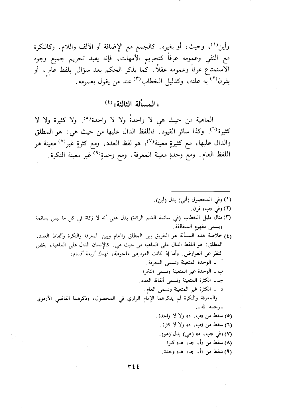 (٤) خلاصة هذه المسألة هو التفريق بين المطلق والعام وبين المعرفة والنكرة وألفاظ العدد.