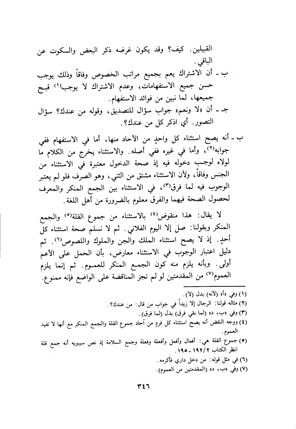ب - أنَّه يصح استثناء كل واحدٍ من الآحاد منها، أما في الاستفهام ففي جوابه (٢)، وأما في غيره ففي أصله. والاستثناء يخرج من الكلام ما لولاه لوجب دخوله فيه إذ صحة الدخول معتبرة في الاستثناء من الجنس وفاقًا، ولأن الاستثناء مشتق من الثني، وهو الصرف فلو لم يعتبر الوجوب فيه لما فرق (٣)، في الاستثناء بين الجمع المنكر والمعرف لحصول الصحة فيهما والفرق معلوم بالضرورة من أهل اللغة.