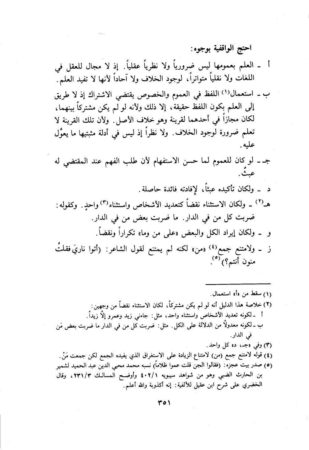 (٥) صدر بيت عجزه: (فقالوا الجن قلت عموا ظلاماً) نسبه محمد محي الدين عبد الحميد لشمير بن الحارث الضبي وهو من شواهد سيبويه ١/ ٤٠٢ وأوضح المسالك ٣/ ٢٣١، وقال الخضري على شرح ابن عقيل للألفية: إنه أكذوبة والله أعلم.
