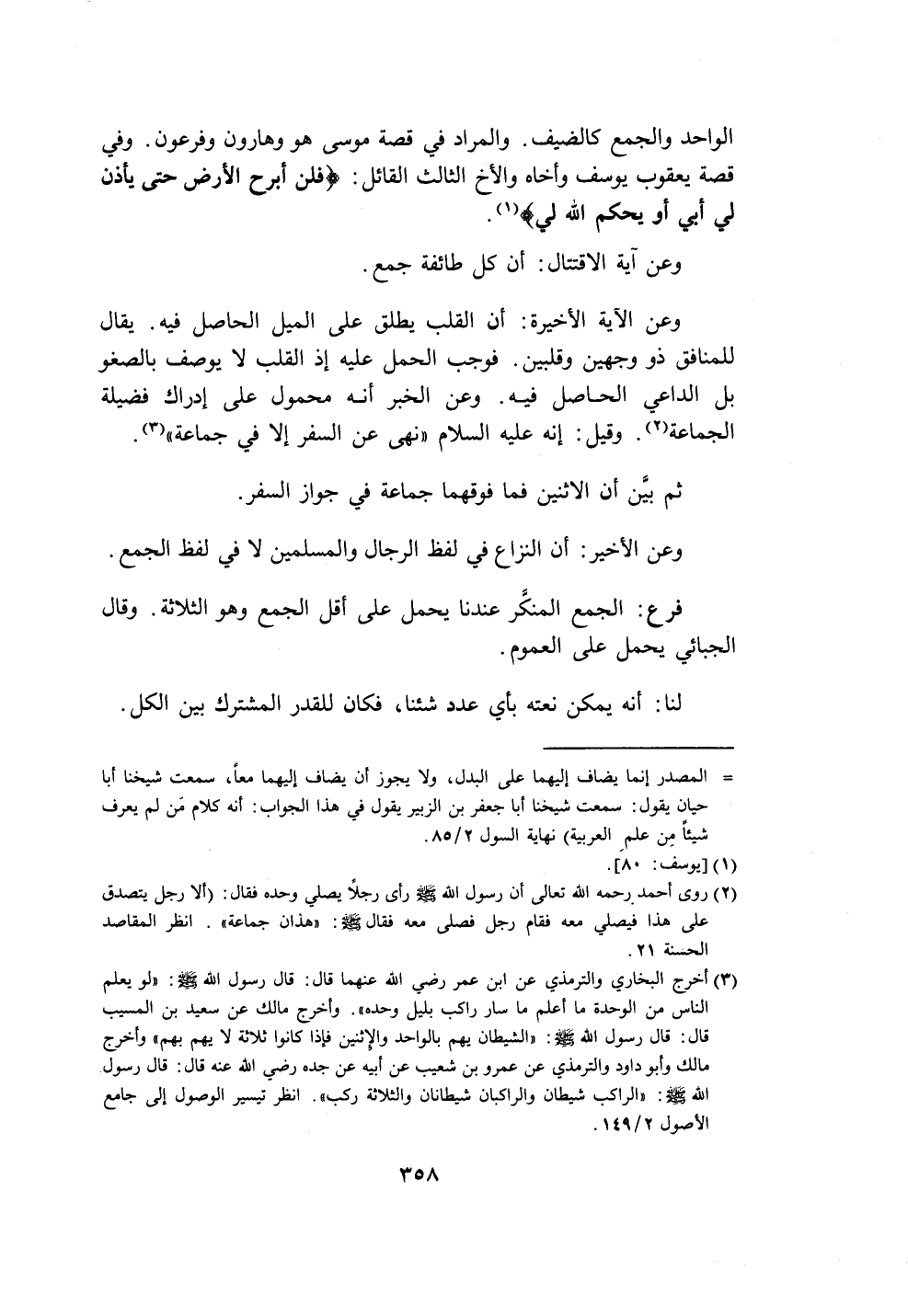 وعن الآية الأخيرة: أن القلب يطلق على الميل الحاصل فيه. يقال للمنافق ذو وجهين وقلبين. فوجب الحمل عليه إذ القلب لا يوصف بالصغو بل الداعي الحاصل فيه. وعن الخبر أنه محمول على إدراك فضيلة الجماعة (٢). وقيل: إنه عليه السلام "نهى عن السفر إلا في جماعة" (٣).