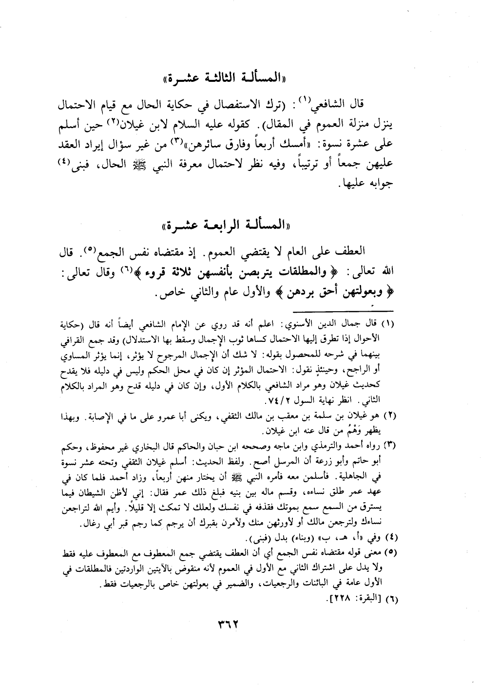 (١) قال جمال الدين الأسنوي: اعلم أنه قد روي عن الِإمام الشافعي أيضاً أنه قال (حكاية الأحوال إذا تطرق إليها الاحتمال كساها ثوب الاجمال وسقط بها الاستدلال) وقد جمع القرافي بينهما في شرحه للمحصول بقوله: لا شك أن الإجمال المرجوح لا يؤثر، إنما يؤثر المساوي أو الراجح، وحينئذٍ نقول: الاحتمال المؤثر إن كان في محل الحكم وليس في دليله فلا يقدح كحديث غيلان وهو مراد الشافعي بالكلام الأول، وإن كان في دليله قدح وهو المراد بالكلام الثاني. انظر نهاية السول ٢/ ٧٤.