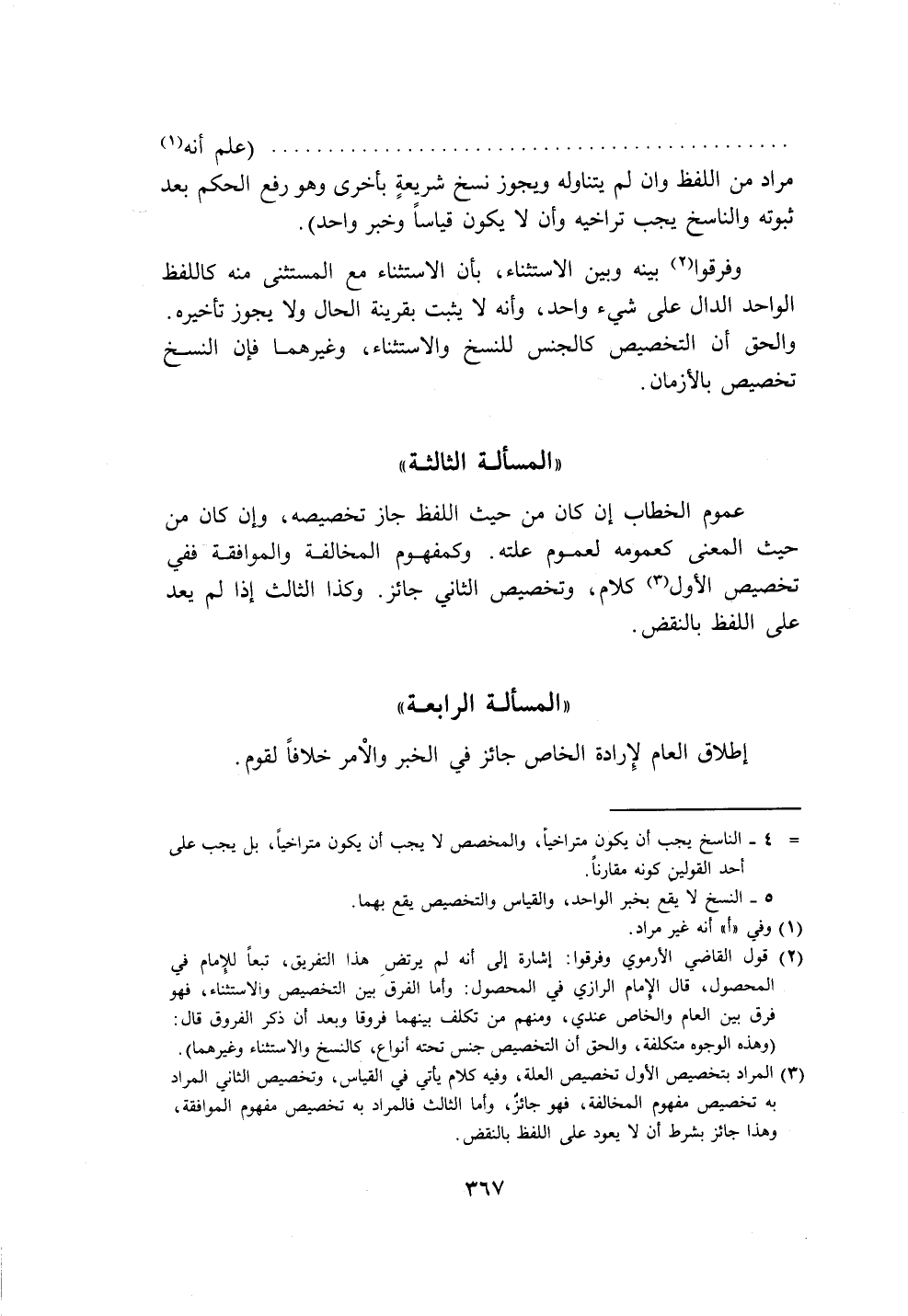 (٣) المراد بتخصيص الأول تخصيص العلة، وفيه كلام يأتي في القياس، وتخصيص الثاني المراد به تخصيص مفهوم المخالفة، فهو جائز، وأما الثالث فالمراد به تخصيص مفهوم الموافقة، وهذا جائز بشرط أن لا يعود على اللفظ بالنقض.