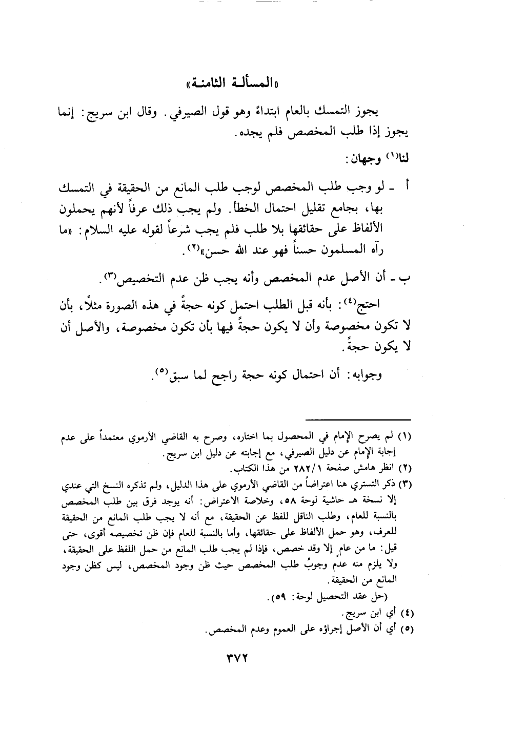 أ- لو وجب طلب المخصص لوجب طلب المانع من الحقيقة في التمسك بها، بجامع تقليل احتمال الخطأ. ولم يجب ذلك عرفاً لأنهم يحملون الألفاظ على حقائقها بلا طلب فلم يجب شرعاً لقوله عليه السلام: "ما رآه المسلمون حسناً فهو عند الله حسن" (٢).