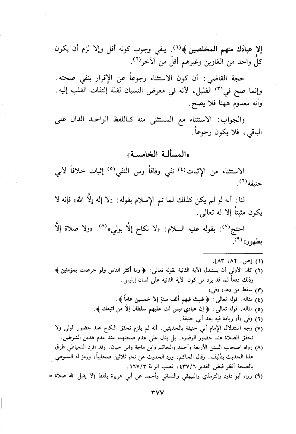 الاستثناء من الِإثبات (٤) نفي وفاقاً ومن النفي (٥) إثبات خلافاً لأبي حنيفة (٦).