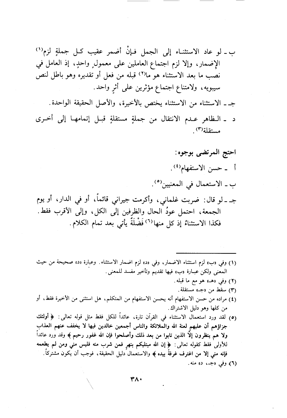 (١) وفي "ب" لزم استثناء الاضمار، وفي "د" لزم اضمار الاستثناء. وعبارة "د" صحيحة من حيث المعنى ولكن عبارة "ب" فيها تقديم وتأخير مفسد للمعنى.
