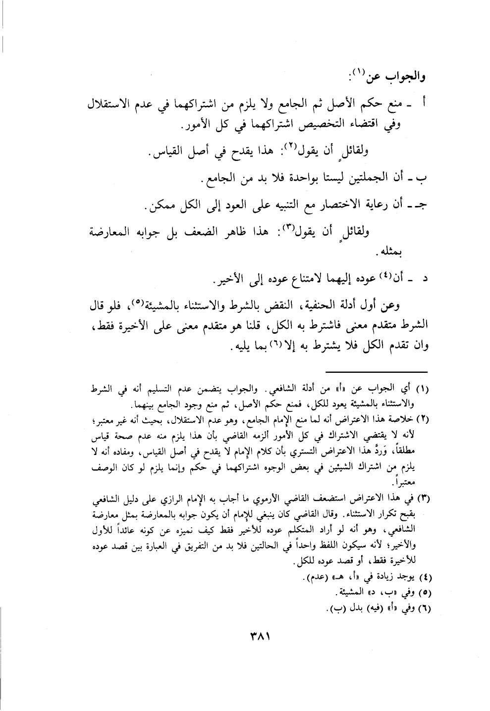 (١) أي الجواب عن "أ" من أدلة الشافعي. والجواب يتضمن عدم التسليم أنه في الشرط والاستثناء بالمشيئة يعود للكل، فمنع حكم الأصل، ثم منع وجود الجامع بينهما.