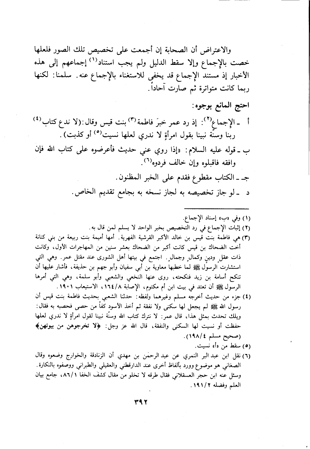 أ- الِإجماع (٢): إذ رد عمر خبرَ فاطمة (٣) بنت قيس وقال: (لا ندع كتاب (٤) ربنا وسنّة نبينا يقول امرأةٍ لا ندري لعلها نسيت (٥) أو كذبت).