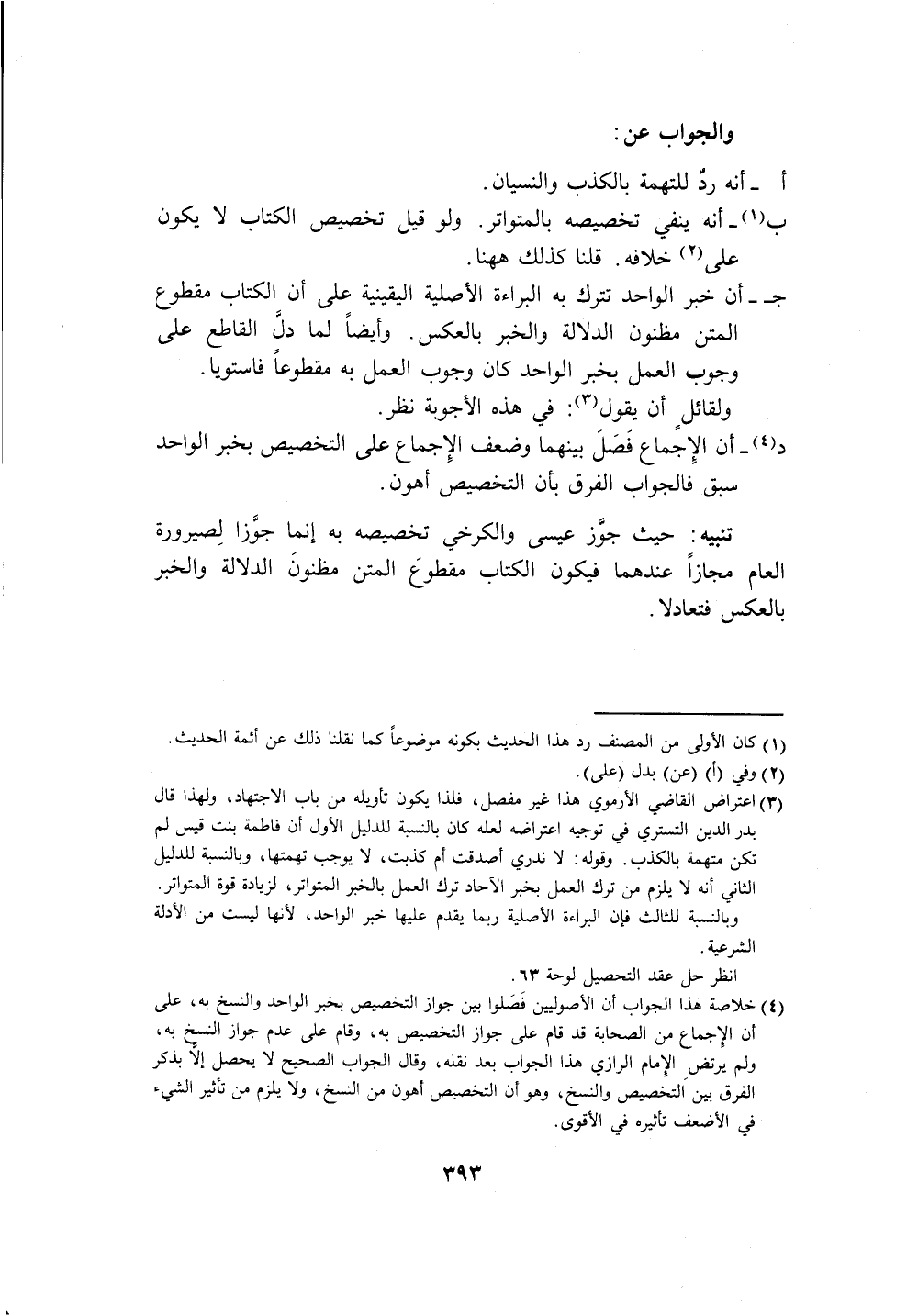 (٤) خلاصة هذا الجواب أن الأصوليين فَصَلوا بين جواز التخصيص بخبر الواحد والنسخ به، على أن الِإجماع من الصحابة قد قام على جواز التخصيص به، وقام على عدم جواز النسخِ به، ولم يرتض الإمام الرازي هذا الجواب بعد نقله، وقال الجواب الصحيح لا يحصل إلا بذكر الفرق بينَ التخصيص والنسخ، وهو أن التخصيص أهون من النسخ، ولا يلزم من تأثير الشيء