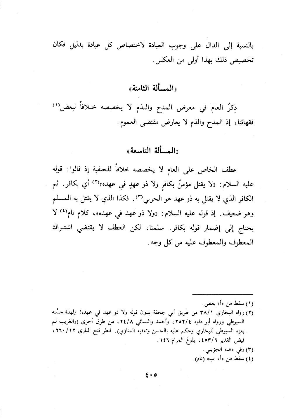 عطف الخاص على العام لا يخصصه خلافًا للحنفية إذ قالوا: قوله عليه السلام: "لا يقتل مؤمن بكافرٍ ولا ذو عهدٍ في عهده" (٢) أي بكافر. ثم الكافر الذي لا يقتل به ذو عهد هو الحربي (٣). فكذا الذي لا يقتل به المسلم وهو ضعيف. إذ قوله عليه السلام: "ولا ذو عهد في عهده"، كلام تام (٤) لا يحتاج إلى إضمار قوله بكافر. سلمنا، لكن العطف لا يقتضي اشتراك