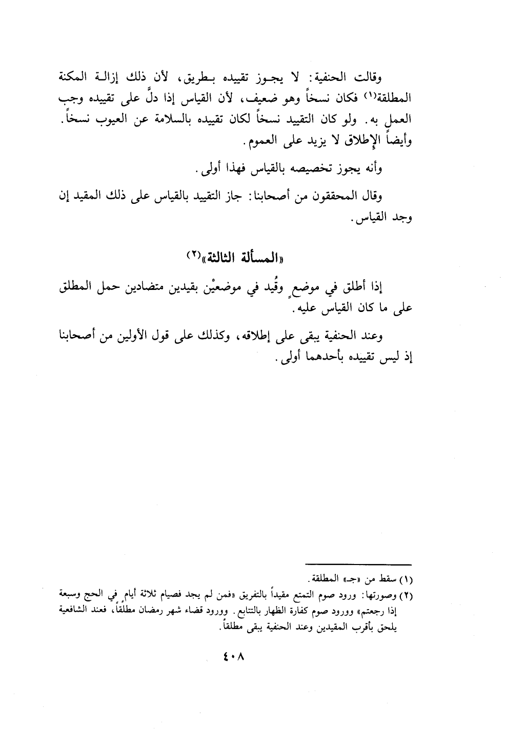 وقالت الحنفية: لا يجوز تقييده بطريق، لأن ذلك إزالة المكنة المطلقة (١) فكان نسخًا وهو ضعيف، لأن القياس إذا دل على تقييده وجب العملِ به. ولو كان التقييد نسخًا لكان تقييده بالسلامة عن العيوب نسخًا.
