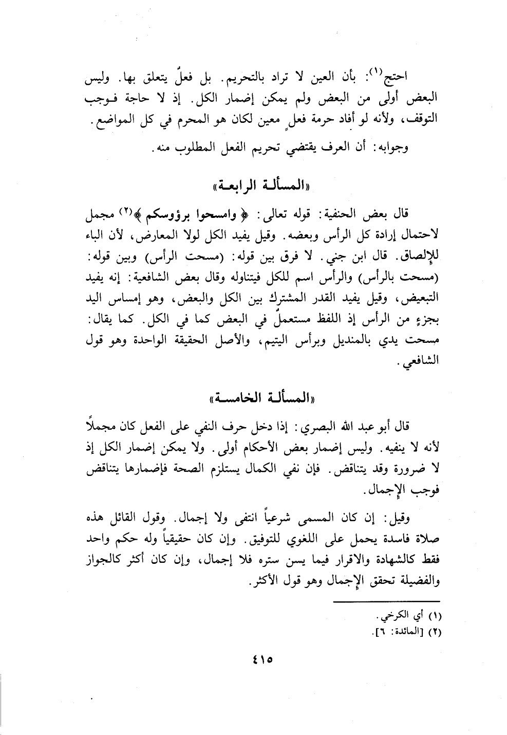 قال بعض الحنفية: قوله تعالى: {وَامْسَحُوا بِرُءُوسِكُمْ} (٢) مجمل لاحتمال إرادة كل الرأس وبعضه. وقيل يفيد الكل لولا المعارض، لأن الباء للِإلصاق. قال ابن جني. لا فرق بين قوله: (مسحت الرأس) وبين قوله: (مسحت بالرأس) والرأس اسم للكل فيتناوله وقال بعض الشافعية: إنه يفيد التبعيض، وقيل يفيد القدر المشترك بين الكل والبعض، وهو إمساس اليد بجزءٍ من الرأس إذ اللفظ مستعملٌ في البعض كما في الكل. كما يقال: مسحت يدي بالمنديل وبرأس اليتيم، والأصل الحقيقة الواحدة وهو قول الشافعي.