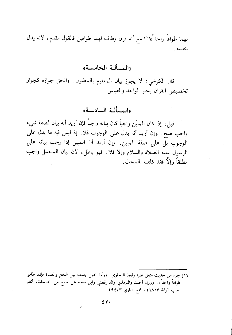(١) جزء من حديث متفق عليه ولفظ البخاري: "وأما الذين جمعوا بين الحج والعمرة فإنما طافوا طوافًا واحدًا". ورواه أحمد والترمذي والدارقطني وابن ماجه عن جمع من الصحابة، أنظر نصب الراية ٣/ ١١٨، فتح الباري ٣/ ٤٩٤.