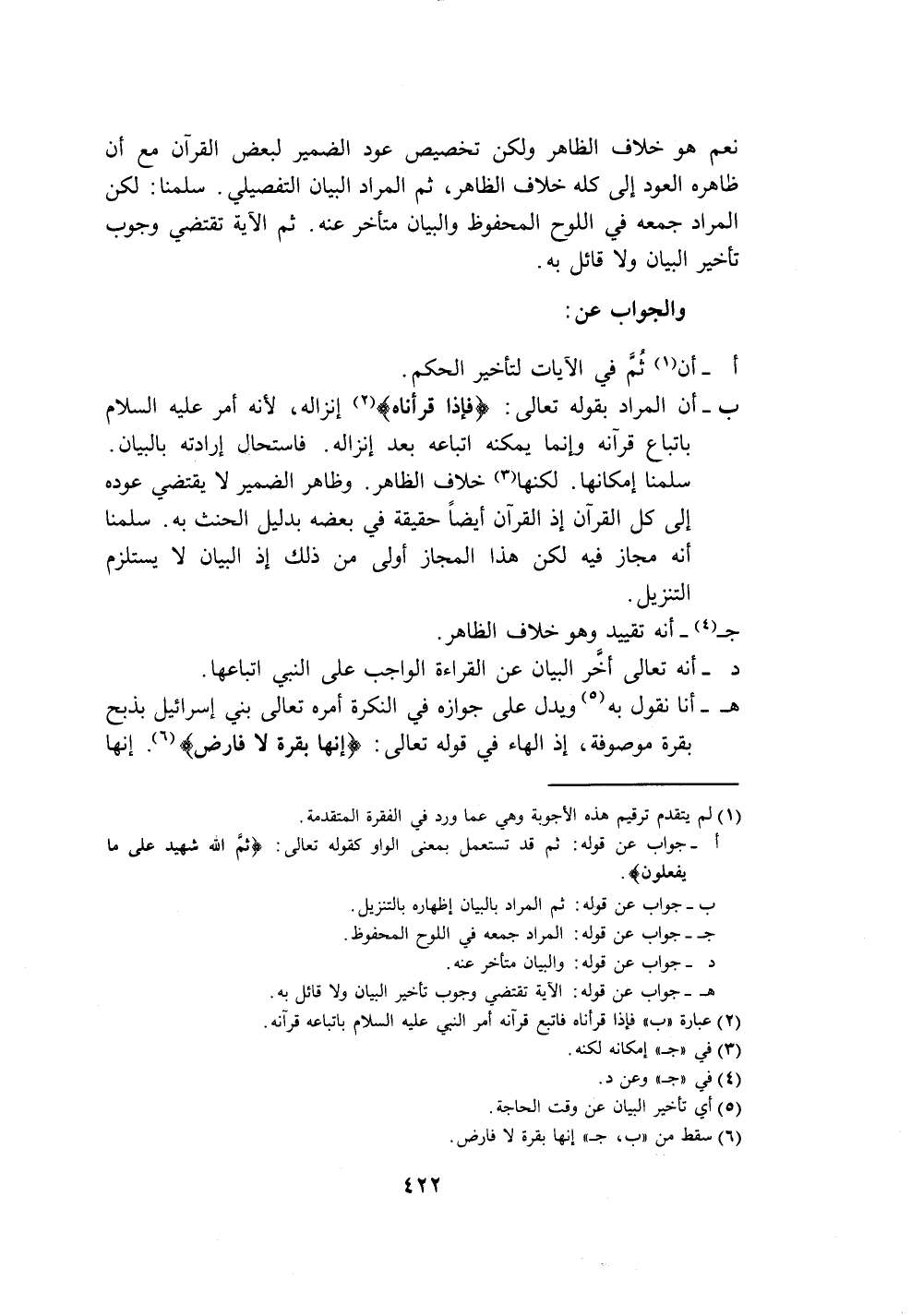 نعم هو خلاف الظاهر ولكن تخصيص عود الضمير لبعض القرآن مع أن ضاهره العود إلى كله خلاف الظاهر، ثم المراد البيان التفصيلي. سلمنا: لكن المراد جمعه في اللوح المحفوظ والبيان متأخر عنه. ثم الآية تقتضي وجوب تأخير البيان ولا قائل به.