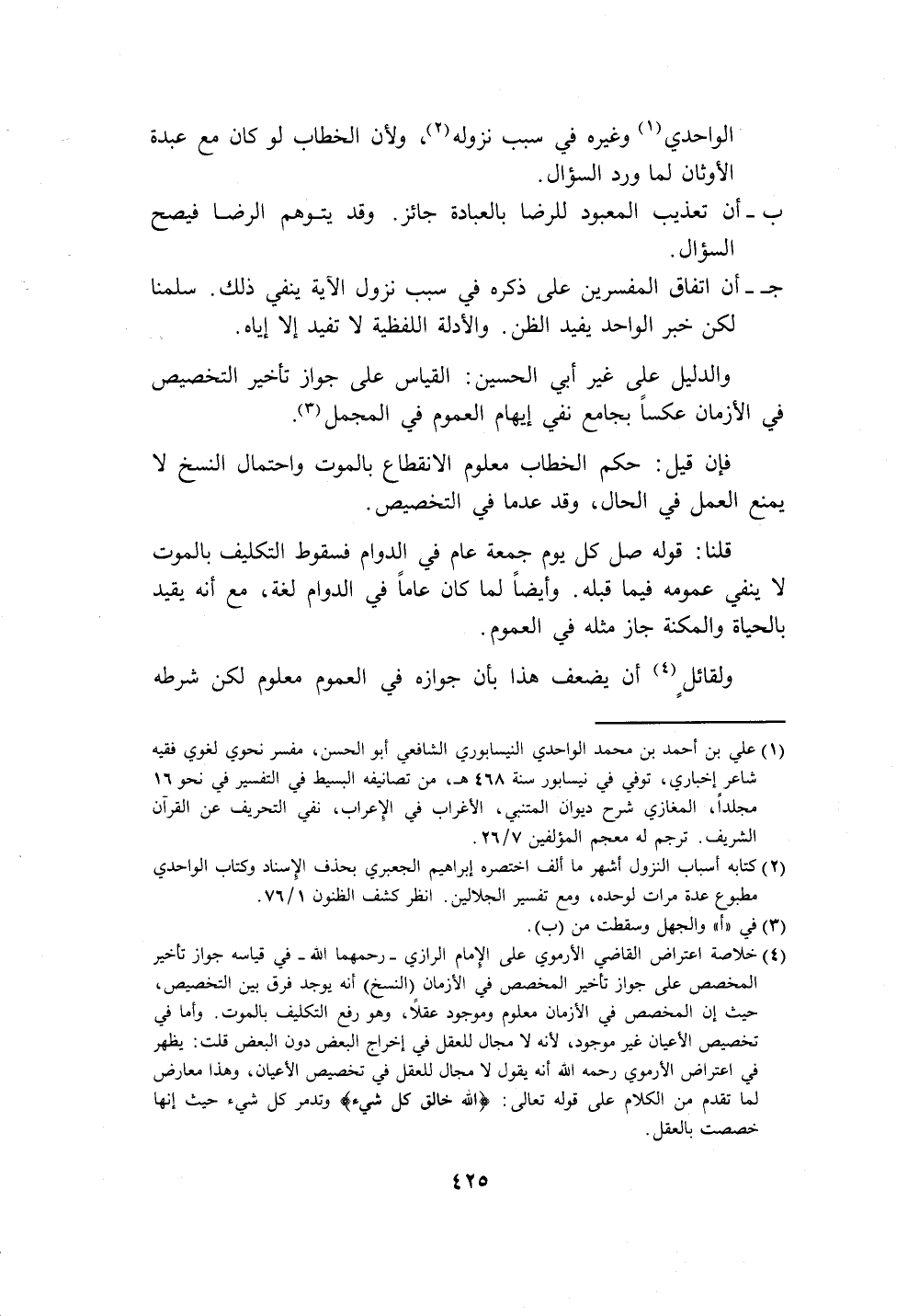 (٤) خلاصة اعتراض القاضي الأرموي على الِإمام الرازي -رحمهما الله- في قياسه جواز تأخير المخصص على جواز تأخير المخصص في الأزمان (النسخ) أنه يوجد فرق بين التخصيص، حيث إن المخصص في الأزمان معلوم وموجود عقلًا، وهو رفع التكليف بالموت. وأما في تخصيص الأعيان غير موجود، لأنه لا مجال للعقل في إخراج البعض دون البعض قلت: يظهر في اعتراض الأرموي رحمه الله أنه يقول لا مجال للعقل في تخصيص الأعيان، وهذا معارض لما تقدم من الكلام على قوله تعالى: {اللَّهُ خَالِقُ كُلِّ شَيْءٍ} وتدمر كل شيء حيث إنها خصصت بالعقل.