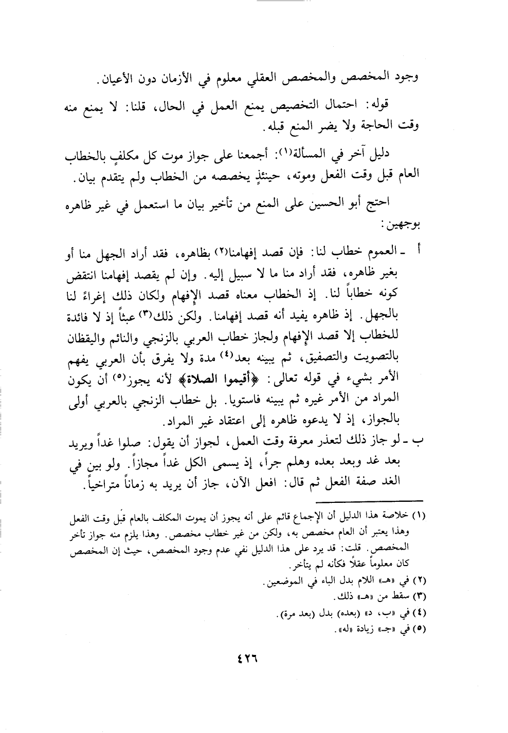 ب - لو جاز ذلك لتعذر معرفة وقت العمل، لجواز أن يقوِل: صلوا غدًا ويريد بعد غد وبعد بعده وهلم جرًا، إذ يسمى الكل غدًا مجازًا. ولو بينِ في الغد صفة الفعل ثم قال: افعل الآن، جاز أن يريد به زمانًا متراخيًا.
