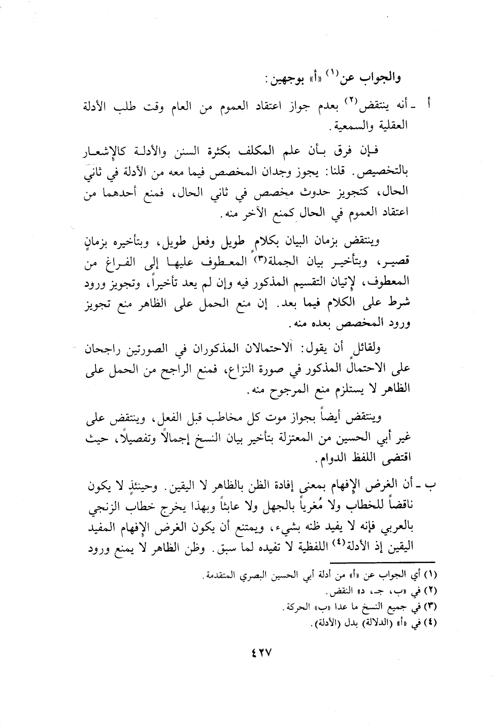 وينتقض أيضًا بجواز موت كل مخاطب قبل الفعل، وينتقض على غير أبي الحسين من المعتزلة بتأخير بيان النسخ إجمالًا وتفصيلًا، حيث اقتضى اللفظ الدوام.