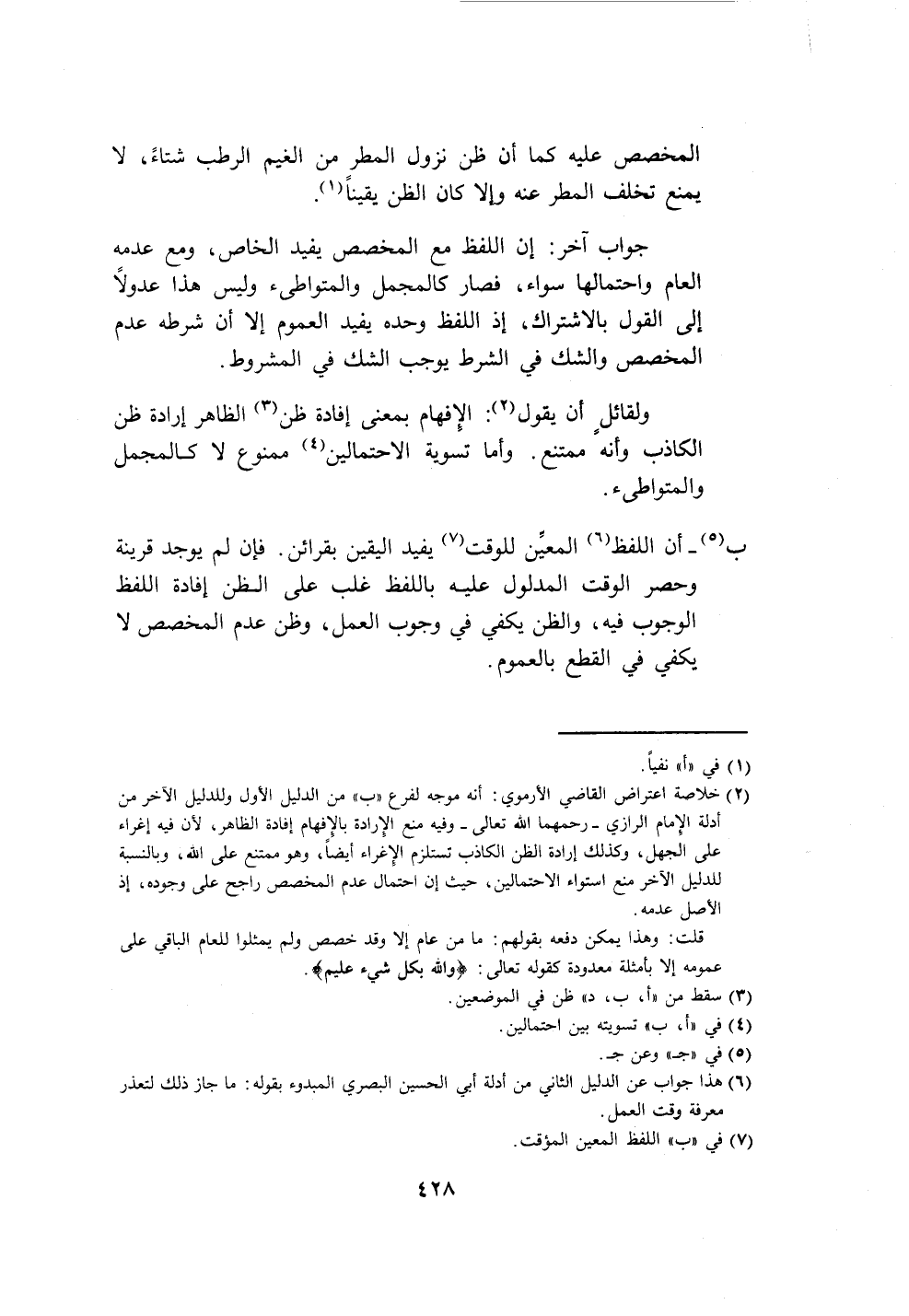 ب (٥) - أن اللفظ (٦) المعيِّن للوقت (٧) يفيد اليقين بقرائن. فإن لم يوجد قرينة وحصر الوقت المدلول عليه باللفظ غلب على الظن إفادة اللفظ الوجوب فيه، والظن يكفي في وجوب العمل، وظن عدم المخصص لا يكفي في القطع بالعموم.