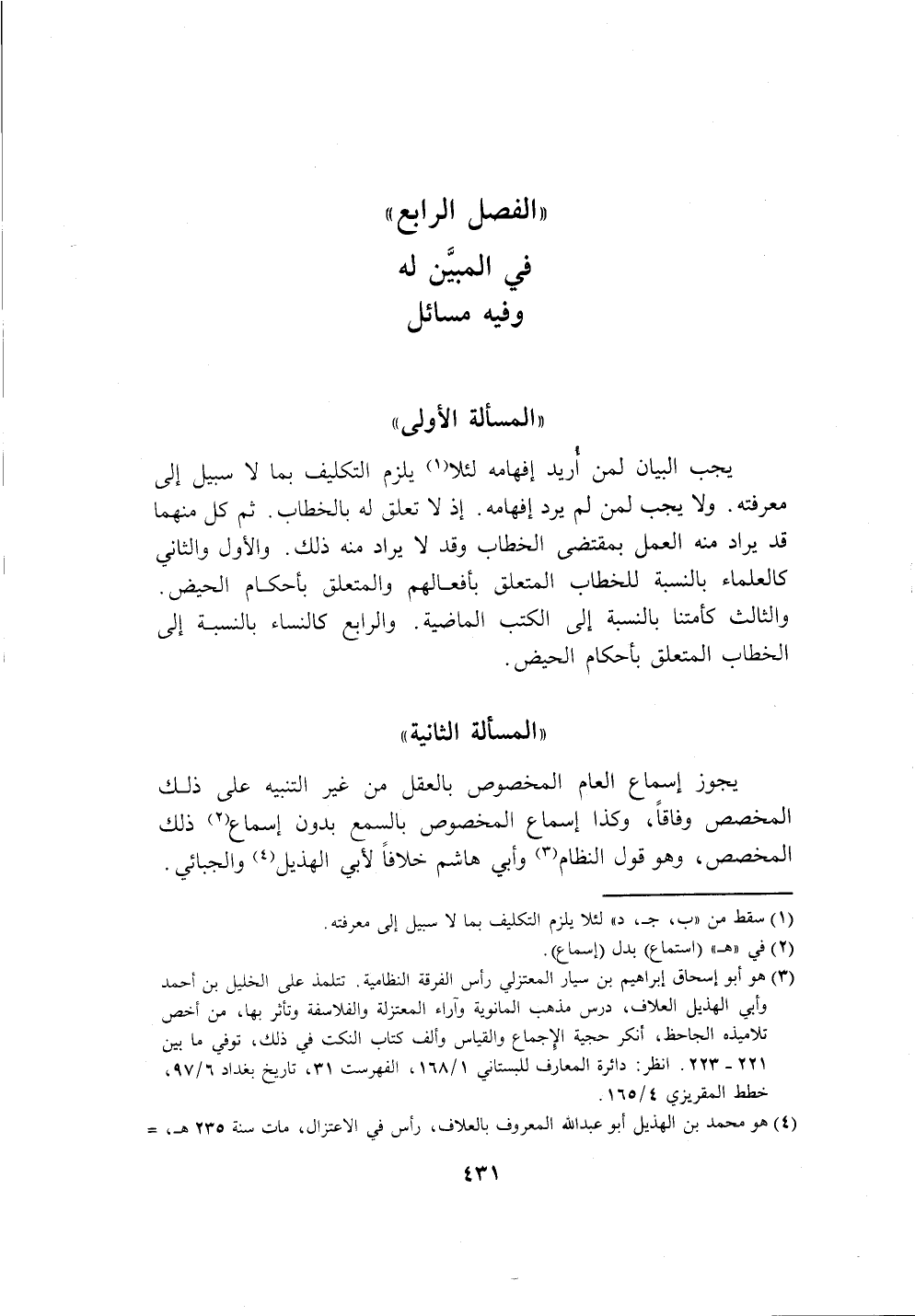 (٤) هو محمد بن الهذيل أبو عبد الله المعروف بالعلاف، رأس في الاعتزال، مات سنة ٢٣٥ هـ، =