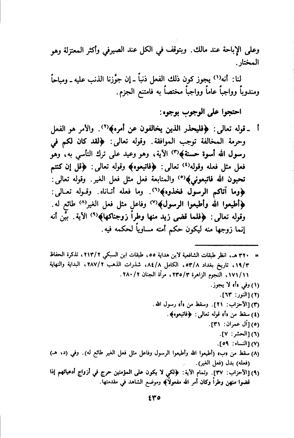 أ - قوله تعالى: {فَلْيَحْذَرِ الَّذِينَ يُخَالِفُونَ عَنْ أَمْرِهِ} (٢). والأمر هو الفعل وحرمة المخالفة توجب الموافقة. وقوله تعالى: {لَقَدْ كَانَ لَكُمْ فِي رَسُولِ اللَّهِ أُسْوَةٌ حَسَنَةٌ} (٣) الآية، وهو وعيد على ترك التأسي به، وهو فعل مثل فعله وقوله (٤) تعالى: {فَاتَّبِعُوهُ} وقوله تعالى: {قُلْ إِنْ كُنْتُمْ تُحِبُّونَ اللَّهَ فَاتَّبِعُونِي} (٥) والمتابعة فعل مثل فعل الخير. وقوله تعالى: {وَمَا آتَاكُمُ الرَّسُولُ فَخُذُوهُ} (٦). وما فعله أتاناه. وقوله تعالى: {أَطِيعُوا اللَّهَ وَأَطِيعُوا الرَّسُولَ} (٧) وفاعلٍ مثل فعل الخير (٨) طائع له.