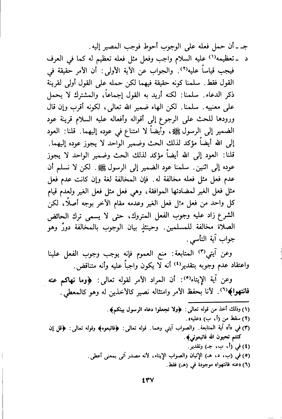 وعن آيتي (٣) المتابعة: منع العموم فإنه يوجب وجوب الفعل علينا واعتقاد عدم وجوبه بتقدير (٤) أنه لا يكون واجبًا عليه وأنه متناقض. وعن آية الإيتاء (٥): أن المراد الأمر لقوله تعالى: {وَمَا نَهَاكُمْ عَنْهُ فَانْتَهُوا} (٦). لأنا بحفظ الأمر وامتثاله نصير كالأخذين له وهو كالمعطي.