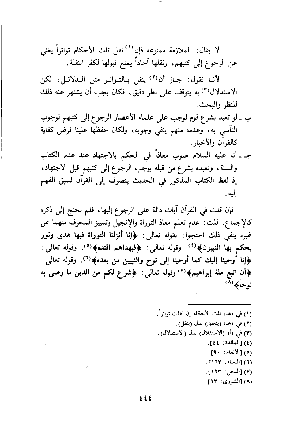 فإن قلت في القرآن آيات دالة على الرجوع إليها، فلم نحتج إلى ذكره كالِإجماع. قلت: عدم تعلم معاذ التوراة والِإنجيل وتمييز المحرف منهما عن غيره ينفي ذلك احتجوا: بقوله تعالى: {إِنَّا أَنْزَلْنَا التَّوْرَاةَ فِيهَا هُدًى وَنُورٌ يَحْكُمُ بِهَا النَّبِيُّونَ} (٤). وقوله تعالى: {فَبِهُدَاهُمُ اقْتَدِهْ} (٥). وقوله تعالى: {إِنَّا أَوْحَيْنَا إِلَيْكَ كَمَا أَوْحَيْنَا إِلَى نُوحٍ وَالنَّبِيِّينَ مِنْ بَعْدِهِ} (٦). وقوله تعالى: {أنِ اتَّبِعْ مِلَّةَ إِبْرَاهِيمَ} (٧) وقوله تعالى: {شَرَعَ لَكُمْ مِنَ الدِّينِ مَا وَصَّى بِهِ نُوحًا} (٨).
