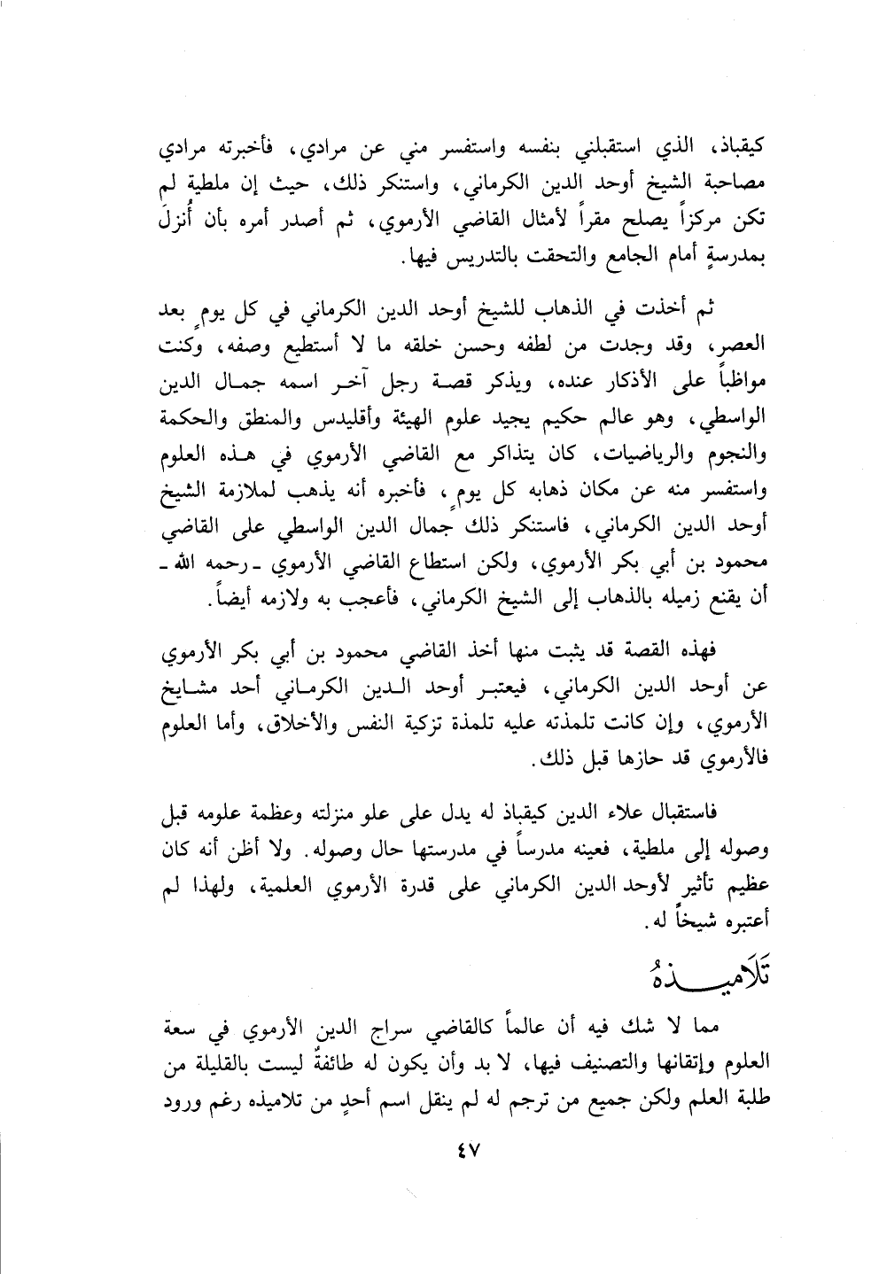 كيقباذ، الذي استقبلني بنفسه واستفسر مني عن مرادي، فأخبرته مرادي مصاحبة الشيخ أوحد الدين الكرماني، واستنكر ذلك، حيث إن ملطية لم تكن مركزاً يصلح مقراً لأمثال القاضي الأرموي، ثم أصدر أمره بأن أُنزلَ بمدرسةٍ أمام الجامع والتحقت بالتدريس فيها.