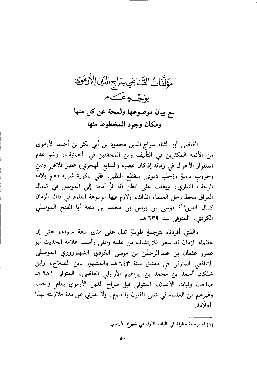 والذي أفردناه بترجمةٍ طويلةٍ تدل على مدى سعة علومه، حتى إن عظماء الزمان قد سعوا للارتشاف من علمه وعلى رأسهم علامة الحديث أبو عمرو عثمان بن عبد الرحمن بن موسى الكردي الشهرزوري الموصلي الشافعي المتوفى في دمشق سنة ٦٤٣ هـ والمشهور بابن الصلاح، وابن خلكان أحمد بن محمد بن إبراهيم الأربيلي القاضي، المتوفى ٦٨١ هـ صاحب وفيات الأعيان، المتوفى قبل سراج الدين الأرموي بعامٍ واحد، وغيرهم من العلماء في شتى الفنون والعلوم. ولا ندري عن مدة ملازمته لهذا العلّامة.