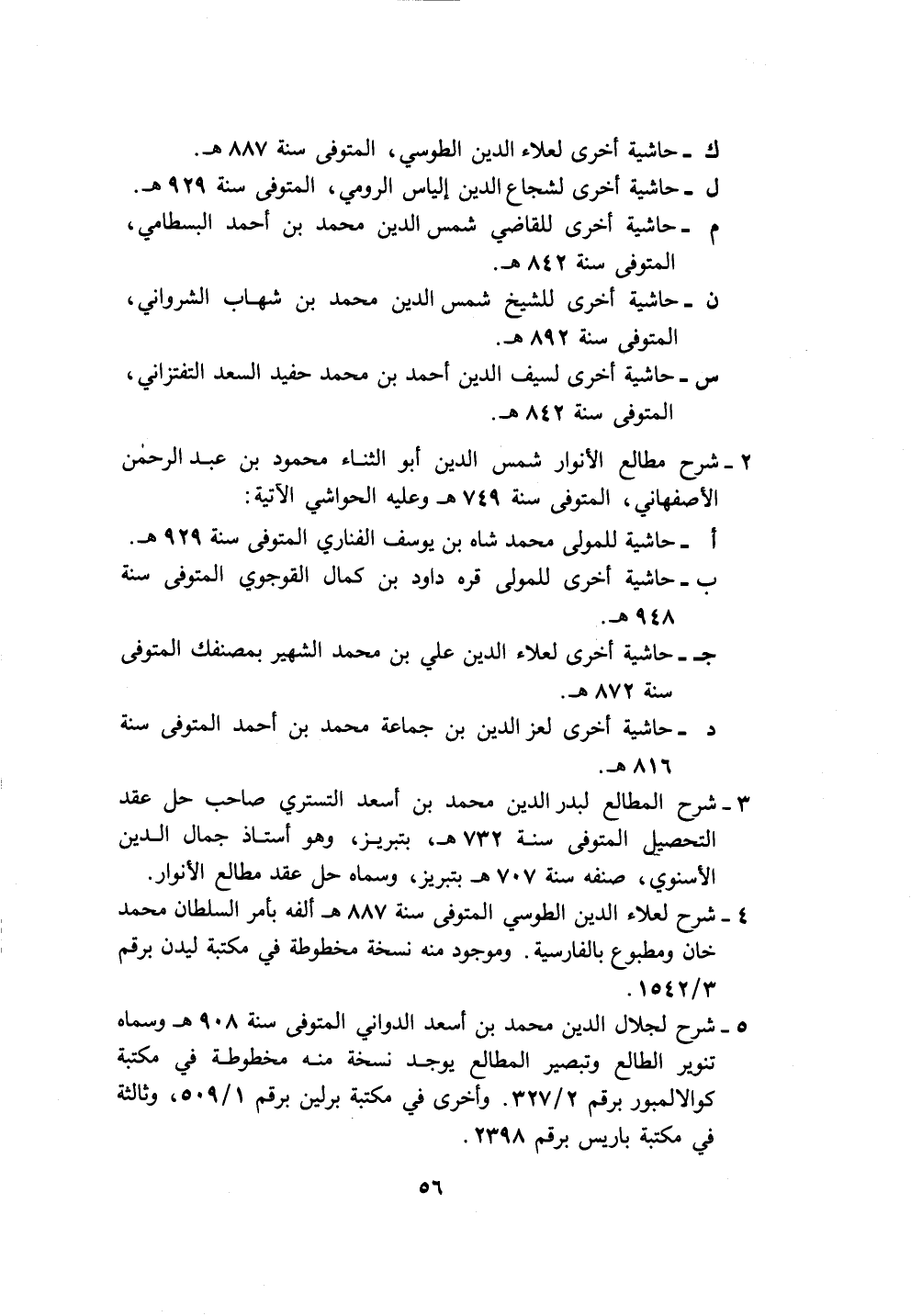 ٢ - شرح مطالع الأنوار شمس الدين أبو الثناء محمود بن عبد الرَّحْمَن الأصفهاني، المتوفى سنة ٧٤٩ هـ وعليه الحواشي الآتية: