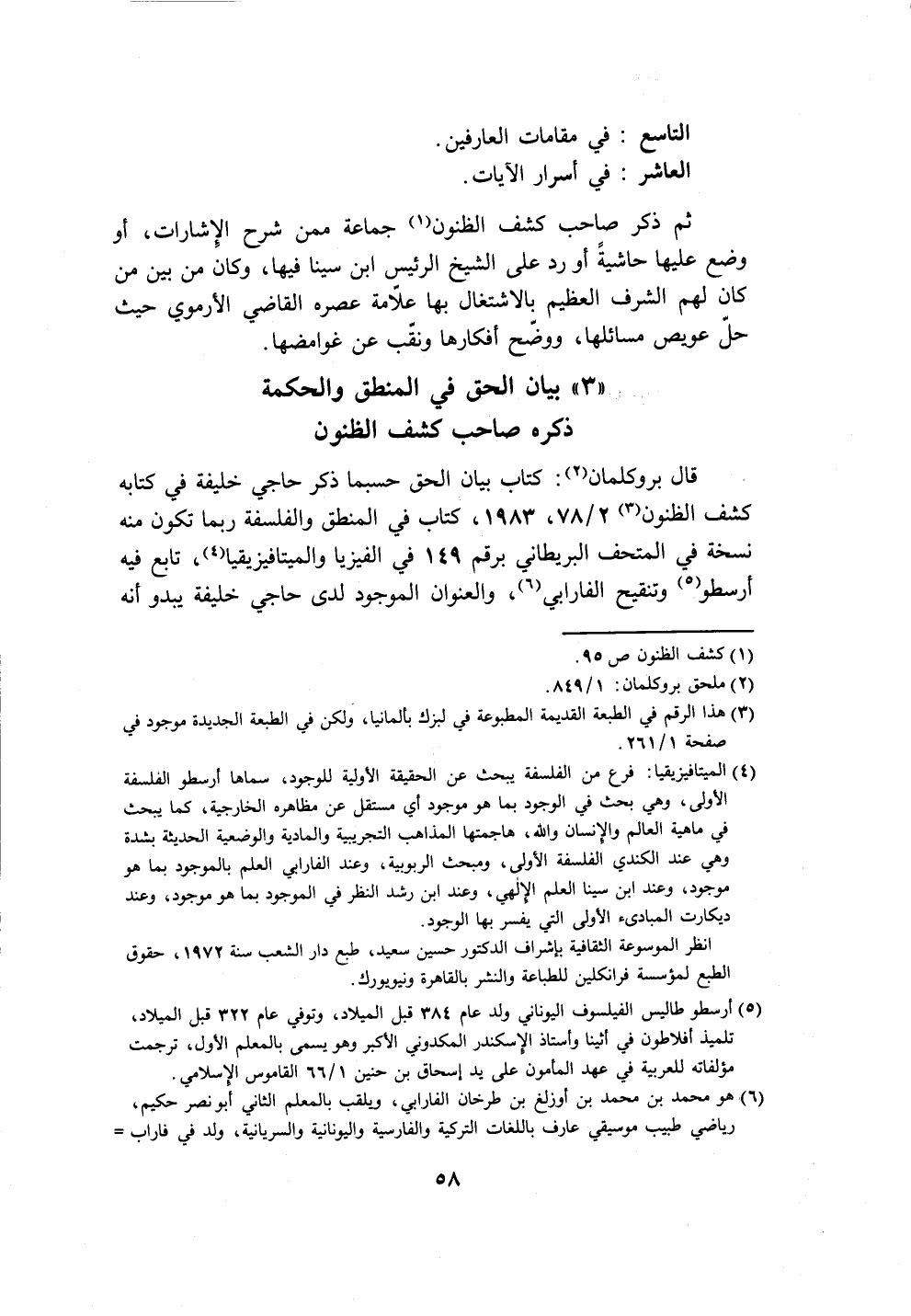 (٦) هو محمَّد بن محمَّد بن أوزلغ بن طرخان الفارابي، ويلقب بالمعلم الثاني أبو نصر حكيم، رياضي طبيب موسيقي عارف باللغات التركية والفارسية واليونانية والسريانية، ولد في فاراب =