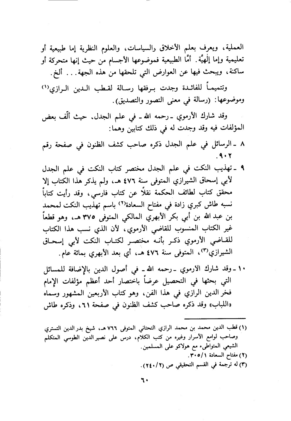 ٩ - تهذيب النكت في علم الجدل مختصر كتاب النكت في علم الجدل لأبي إسحاق الشيرازي المتوفى سنة ٤٧٦ هـ، ولم يذكر هذا الكتاب إلَّا محقق كتاب لطائف الحكمة نقلًا عن كتاب فارسي، وقد رأيت كتابًا نسبه طاش كبري زادة في مفتاح السعادة (٢) باسم تهذيب النكت لمحمد بن عبد الله بن أبي بكر الأبهري المالكي المتوفى ٣٧٥ هـ، وهو قطعًا غير الكتاب المنسوب للقاضي الأرموي, لأن الذي نسب هذا الكتاب للقاضي الأرموي ذكر بأنه مختصر لكتاب النكت لأبي إسحاق الشيرازي (٣)، المتوفى سنة ٤٧٦ هـ، أي بعد الأبهري بمائة عام.