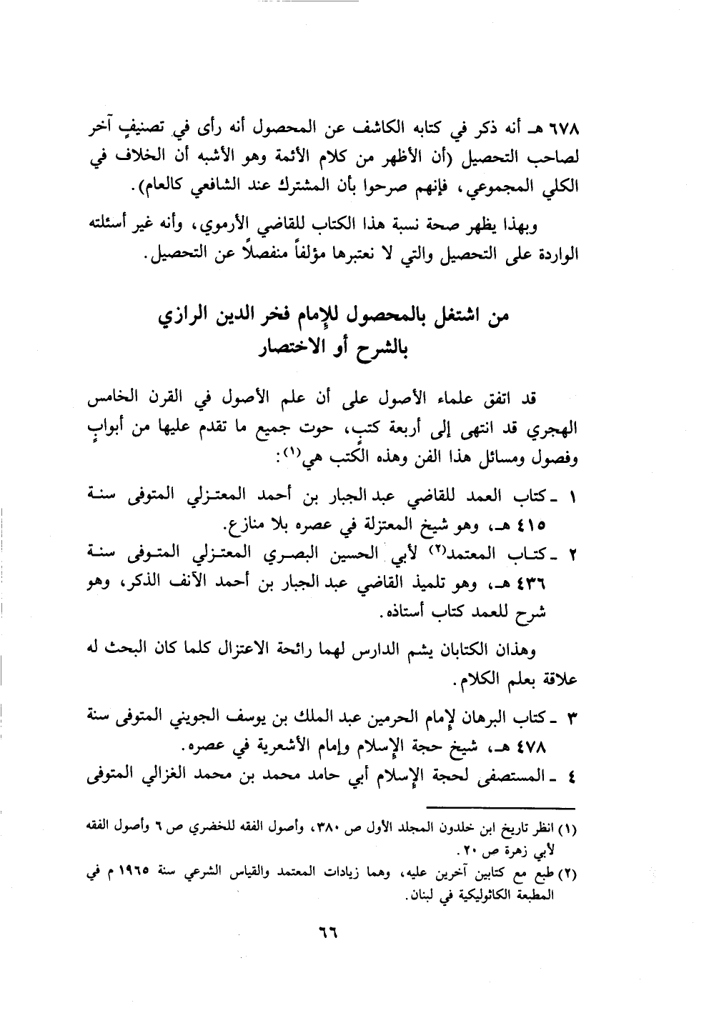 ٢ - كتاب المعتمد (٢) لأبي الحسين البَصْرِيّ المعتزلي المتوفى سنة ٤٣٦ هـ، وهو تلميذ القاضي عبد الجبار بن أَحْمد الآنف الذكر، وهو شرح للعمد كتاب أستاذه.