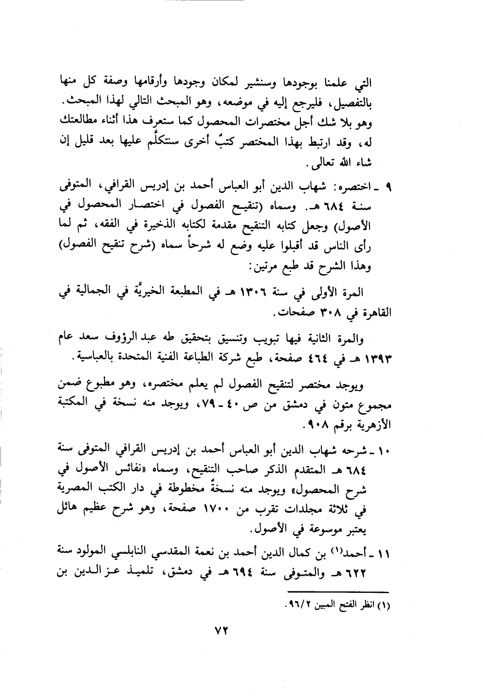 ٩ - اختصره: شهاب الدين أبو العباس أحمد بن إدريس القرافي، المتوفى سنة ٦٨٤ هـ. وسماه (تنقيح الفصول في اختصار المحصول في الأصول) وجعل كتابه التنقيح مقدمة لكتابه الذخيرة في الفقه، ثم لما رأى النَّاس قد أقبلوا عليه وضع له شرحًا سماه (شرح تنقيح الفصول) وهذا الشرح قد طبع مرتين: