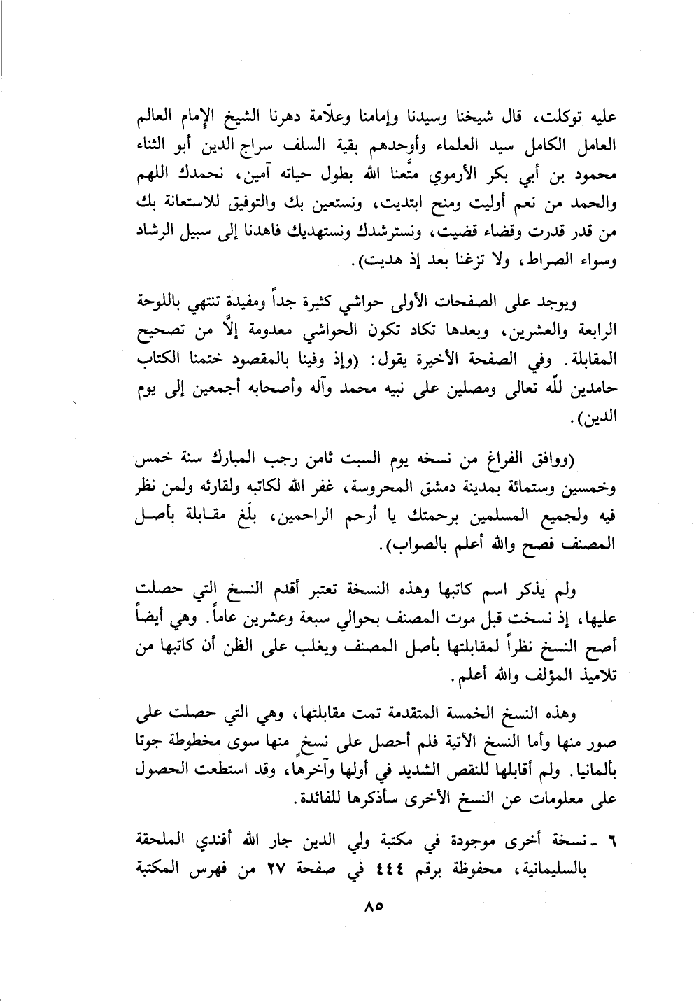 ٦ - نسخة أخرى موجودة في مكتبة ولي الدين جار الله أفندي الملحقة بالسليمانية، محفوظة برقم ٤٤٤ في صفحة ٢٧ من فهرس المكتبة