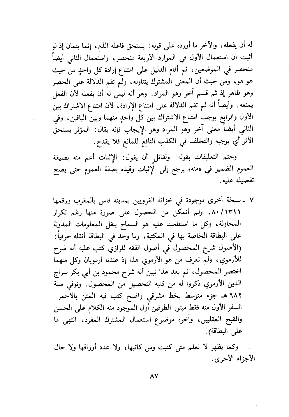 ٧ - نسخة أخرى موجودة في خزانة القرويين بمدينة فاس بالمغرب ورقمها ١٣١١/ ٨٠، ولم أتمكن من الحصول على صورة منها رغم تكرار المحاولة، وكل ما استطعت عليه هو السماح بنقل المعلومات المدونة على البطاقة الخاصة بها في المكتبة، وما وجد في البطاقة أنقله حرفيًا: (الأصول شرح المحصول في أصول الفقه للرازي كتب عليه أنَّه شرح للأرموي، ولم نعرف من هو الأرموي هذا إذ عندنا أرمويان وكل منهما اختصر المحصول، ثم بعد هذا تبين أنَّه شرح محمود بن أبي بكر سراج الدين الأرموي ذكروا له من كتبه التحصيل من المحصول. وتوفي سنة ٦٨٢ هـ جزء متوسط بخط مشرقي واضح كتب فيه المتن بالأحمر.