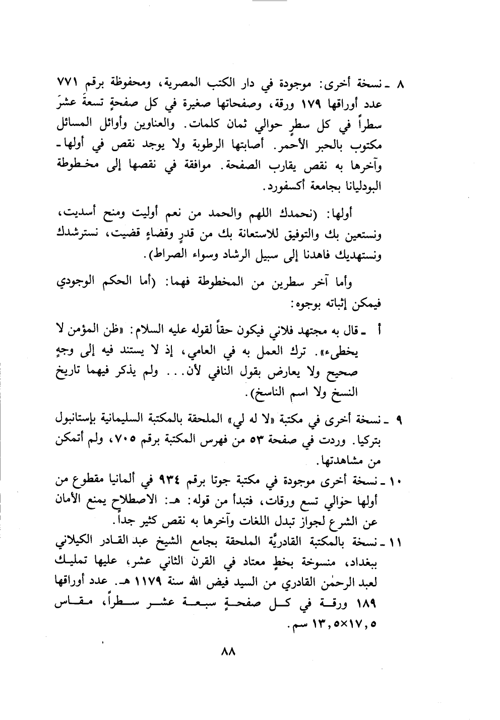 ١١ - نسخة بالمكتبة القادريَّة الملحقة بجامع الشيخ عبد القادر الكيلاني ببغداد، منسوخة بخطٍ معتاد في القرن الثاني عشر، عليها تمليك لعبد الرَّحْمَن القادري من السيد فيض الله سنة ١١٧٩ هـ. عدد أوراقها ١٨٩ ورقة في كل صفحةٍ سبعة عشر سطرًا، مقاس ١٧.٥ × ١٣.٥ سم.
