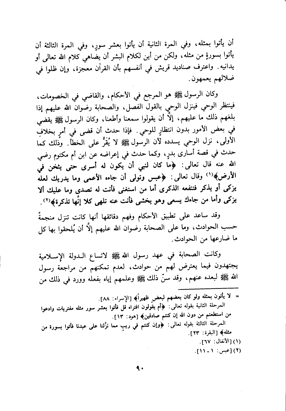 وكان الرسول - صلى الله عليه وسلم - هو المرجع في الأحكام، والقاضي في الخصومات، فينتظر الوحي فينزل الوحيِ بالقول الفصل، والصحابة رضوان الله عليهم إذا بلغهم ذلك ما عليهم، إلَّا أن يقولوا سمعنا وأطعنا، وكان الرسول - صلى الله عليه وسلم - يقضي في بعض الأمور بدون انتظارٍ للوحي. فإذا حدث أن قضى في أمرٍ بخلافِ الأولى، نزل الوحي يسدده لأن الرسول - صلى الله عليه وسلم - لا يُقَرُّ على الخطأ. وَذلك كما حدث في قصة أسارى بدرٍ، وكما حدث في إعراضه عن ابن أم مكتوم رضي الله عنه قال تعالى: {مَا كَانَ لِنَبِيٍّ أَنْ يَكُونَ لَهُ أَسْرَى حَتَّى يُثْخِنَ فِي الْأَرْضِ} (١) وقال تعالى: {عَبَسَ وَتَوَلَّى أَنْ جَاءَهُ الْأَعْمَى وَمَا يُدْرِيكَ لَعَلَّهُ يَزَّكَّى أَوْ يَذَّكَّرُ فَتَنْفَعَهُ الذِّكْرَى أَمَّا مَنِ اسْتَغْنَى فَأَنْتَ لَهُ تَصَدَّى وَمَا عَلَيْكَ أَلَّا يَزَّكَّى وَأَمَّا مَنْ جَاءَكَ يَسْعَى وَهُوَ يَخْشَى فَأَنْتَ عَنْهُ تَلَهَّى كَلَّا إِنَّهَا تَذْكِرَةٌ} (٢).