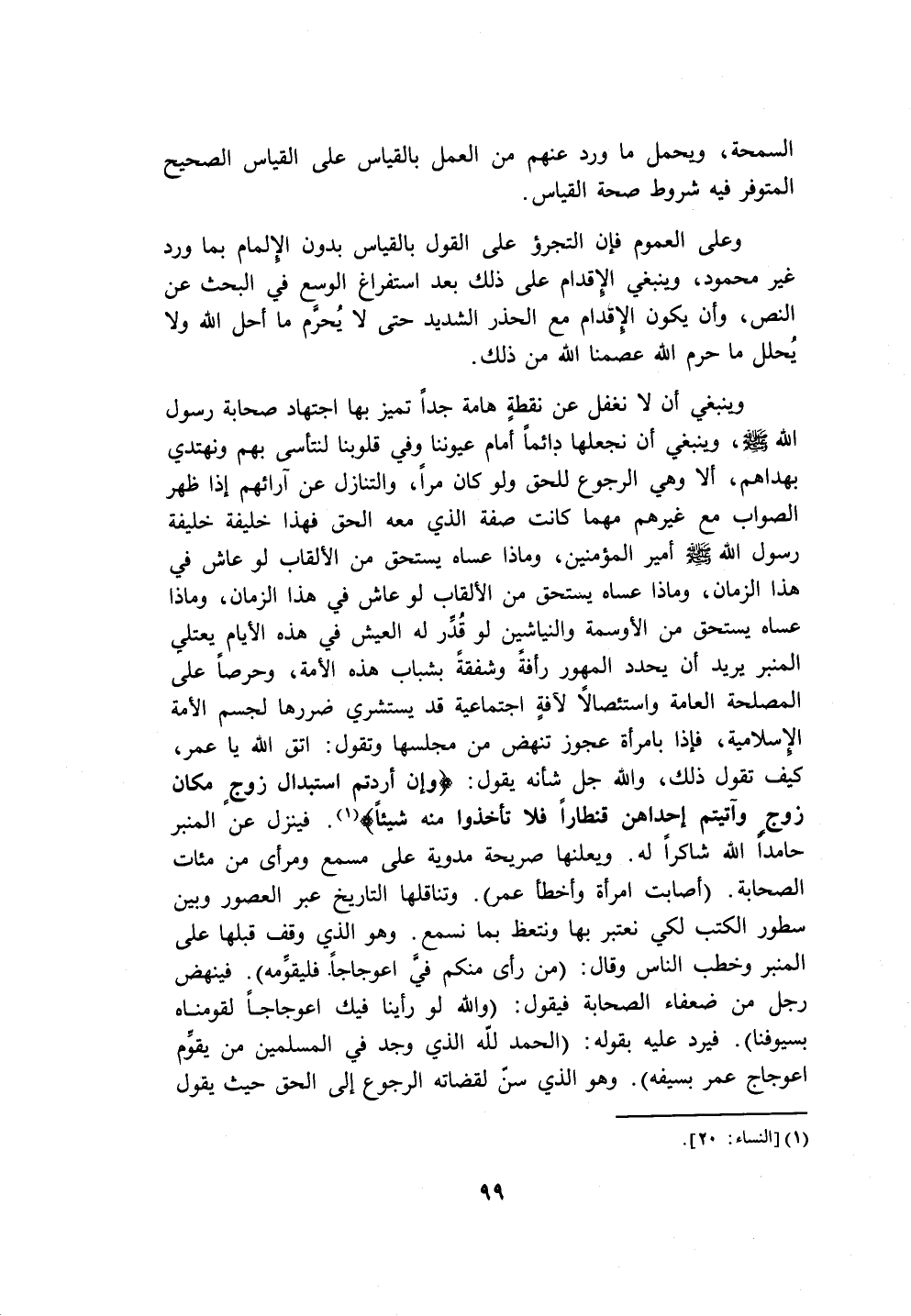 وينبغي أن لا نغفل عن نقطةٍ هامة جدًا يتميز بها اجتهاد صحابة رسول الله - صلى الله عليه وسلم -، وينبغي أن نجعلها دائمًا أمام عيوننا وفي قلوبنا لنتأسى بهم ونهتدي بهداهم، ألا وهي الرجوع للحق ولو كان مرًا، والتنازل عن آرائهم إذا ظهر الصواب مع غيرهم مهما كانت صفة الذي معه الحق فهذا خليفة خليفة رسول الله -صلى الله عليه وسلم- أمير المؤمنين، وماذا عساه يستحق من الألقاب لو عاش في هذا الزمان، وماذا عساه يستحق من الألقاب لو عاش في هذا الزمان، وماذا عساه يستحق من الأوسمة والنياشين لو قُدِّر له العيش في هذه الأيام يعتلي المنبر يريد أن يحدد المهور رأفةً وشفقةً بشباب هذه الأمة، وحرصًا على المصلحة العامة واستئصالًا لآفةٍ اجتماعية قد يستشري ضررها لجسم الأمة الإِسلامية، فإذا بامرأة عجوز تنهض من مجلسها وتقول: اتق الله يا عمر، كيف تقول ذلك، والله جل شأنه يقول: {وَإِنْ أَرَدْتُمُ اسْتِبْدَالَ زَوْجٍ مَكَانَ زَوْجٍ وَآتَيْتُمْ إِحْدَاهُنَّ قِنْطَارًا فَلَا تَأْخُذُوا مِنْهُ شَيْئًا} (١). فينزل عن المنبر حامدًا الله شاكرًا له. ويعلنها صريحة مدوية على مسمع ومرأى من مئات الصَّحَابَة. (أصابت امرأة وأخطأ عمر). وتناقلها التاريخ عبر العصور وبين سطور الكتب لكي نعتبر بها ونتعظ بما نسمع. وهو الذي وقف قبلها على المنبر وخطب النَّاس وقال: (من رأى منكم فيَّ اعوجاجًا فليقوِّمه). فينهض رجل من ضعفاء الصَّحَابَة فيقول: (والله لو رأينا فيك اعوجاجًا لقومناه بسيوفنا). فيرد عليه بقوله: (الحمد لله الذي وجد في المسلمين من يقوِّم اعوجاج عمر بسيفه). وهو الذي سنّ لقضاته الرجوع إلى الحق حيث يقول