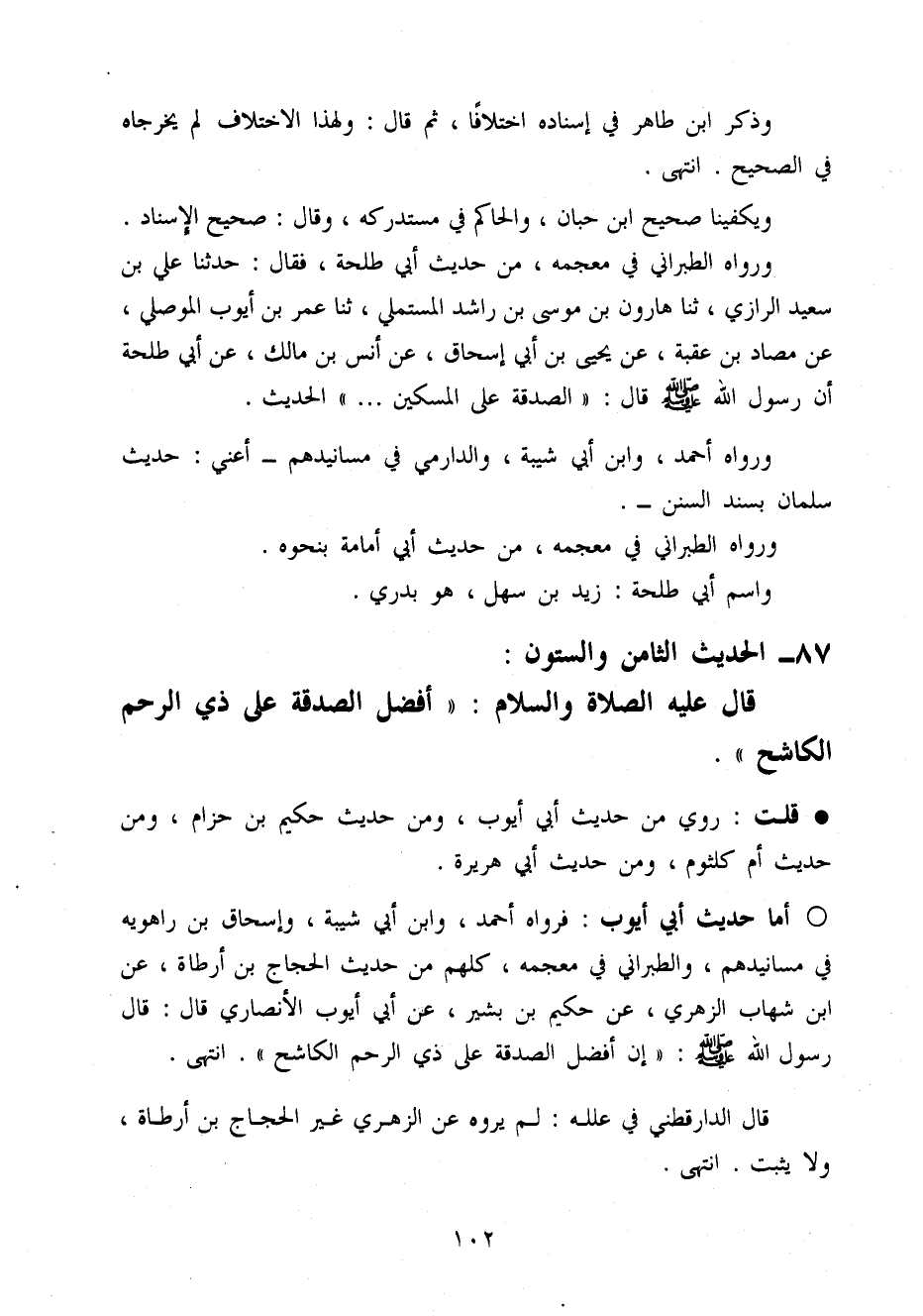 أما حَدِيث أبي أَيُّوب فَرَوَاهُ أَحْمد وَابْن أبي شيبَة وَإِسْحَاق بن رَاهَوَيْه فِي مسانيدهم وَالطَّبَرَانِيّ فِي مُعْجَمه كلهم من حَدِيث الْحجَّاج بن أَرْطَاة عَن ابْن شهَاب الزُّهْرِيّ عَن حَكِيم بن بشير عَن أبي أَيُّوب الْأنْصَارِيّ قَالَ قَالَ رَسُول الله صَلَّى اللَّهُ عَلَيْهِ وَسَلَّم َ إِن أفضل الصَّدَقَة عَلَى ذِي الرَّحِم الْكَاشِح انْتَهَى