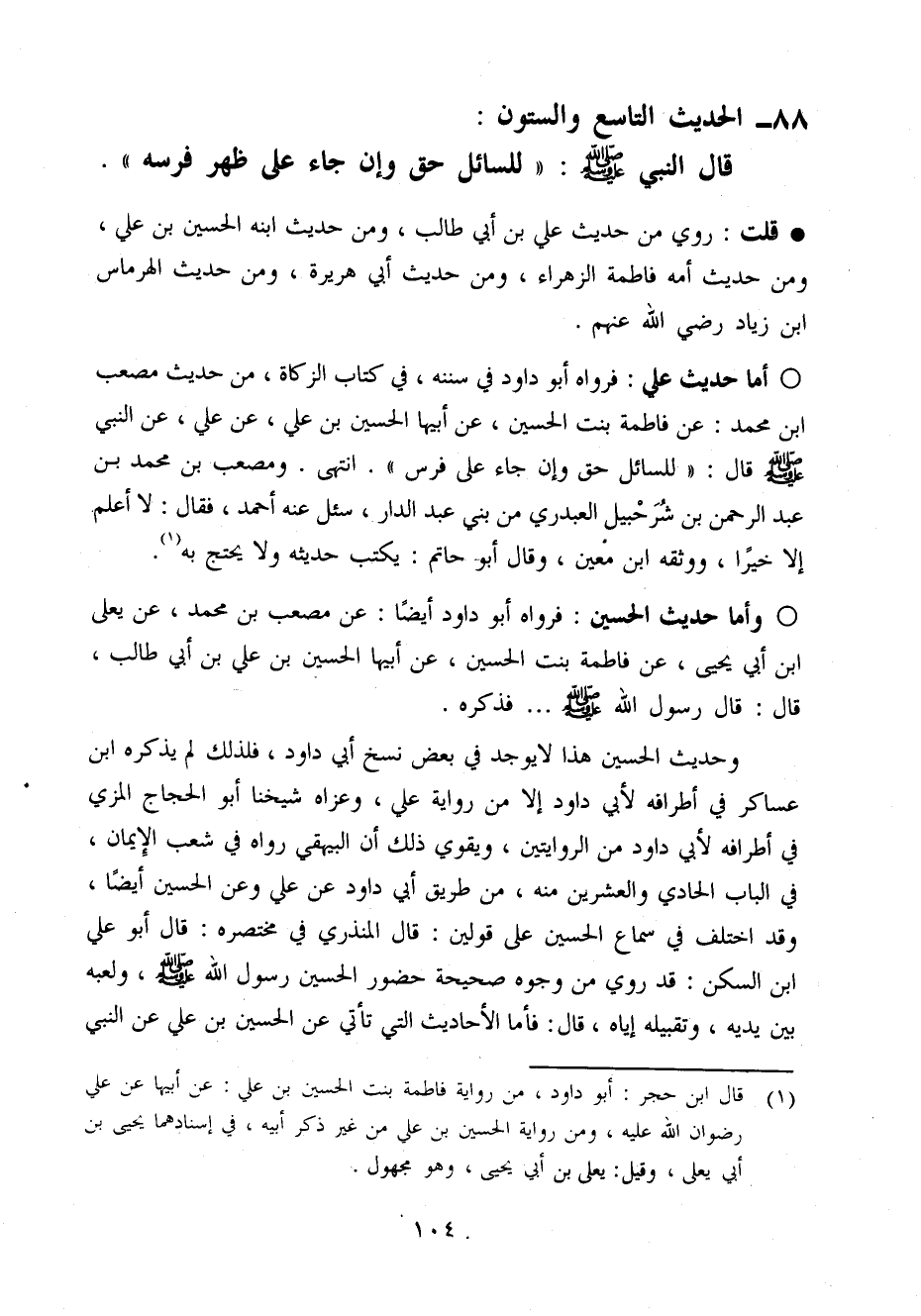 أما حَدِيث عَلّي فَرَوَاهُ أَبُو دَاوُد فِي سنَنه فِي كتاب الزَّكَاة من حَدِيث مُصعب ابْن مُحَمَّد عَن فَاطِمَة بنت الْحُسَيْن عَن أَبِيهَا الْحُسَيْن بن عَلّي عَن عَلّي عَن النَّبِي صَلَّى اللَّهُ عَلَيْهِ وَسَلَّم َ قَالَ للسَّائِل حق وَإِن جَاءَ عَلَى فرس انْتَهَى وَمصْعَب بن مُحَمَّد بن عبد الرَّحْمَن بن شُرَحْبِيل الْعَبدَرِي من بني عبد الدَّار سُئِلَ عَنهُ أَحْمد فَقَالَ لَا أعلم إِلَّا خيرا وَوَثَّقَهُ ابْن معِين وَقَالَ أَبُو حَاتِم يكْتب حَدِيثه وَلَا يحْتَج بِهِ