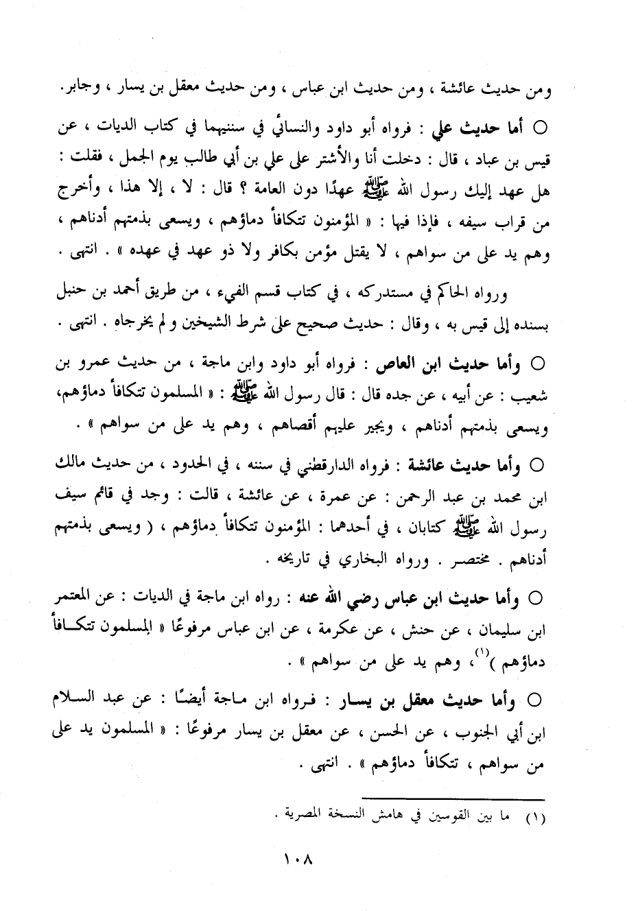 وَأما حَدِيث ابْن الْعَاصِ فَرَوَاهُ أَبُو دَاوُد وَابْن ماجة من حَدِيث عَمْرو بن شُعَيْب عَن أَبِيه عَن جده قَالَ قَالَ رَسُول الله صَلَّى اللَّهُ عَلَيْهِ وَسَلَّم َ الْمُسلمُونَ تَتَكَافَأ دِمَاؤُهُمْ وَيسْعَى بِذِمَّتِهِمْ أَدْنَاهُم وَيُجِير عَلَيْهِم أَقْصَاهُم وهم يَد عَلَى من سواهُم