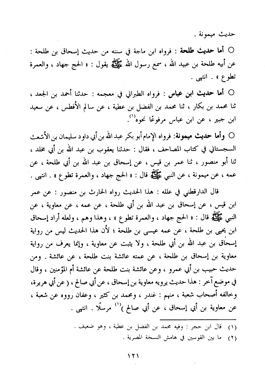 وَأما حَدِيث مَيْمُونَة فَرَوَاهُ الإِمَام أَبُو بكر عبد الله بن أبي دَاوُد سُلَيْمَان بن الْأَشْعَث السجسْتانِي فِي كتاب الْمَصَاحِف فَقَالَ حَدثنَا يَعْقُوب بن عبد الله بن أبي مخلد ثَنَا أَبُو مَنْصُور ثَنَا عمر بن قيس عَن إِسْحَاق بن عبد الله بن أبي طَلْحَة عَن عَمه عَن مَيْمُونَة عَن النَّبِي صَلَّى اللَّهُ عَلَيْهِ وَسَلَّم َ قَالَ الْحَج جِهَاد وَالْعمْرَة تطوع انْتَهَى