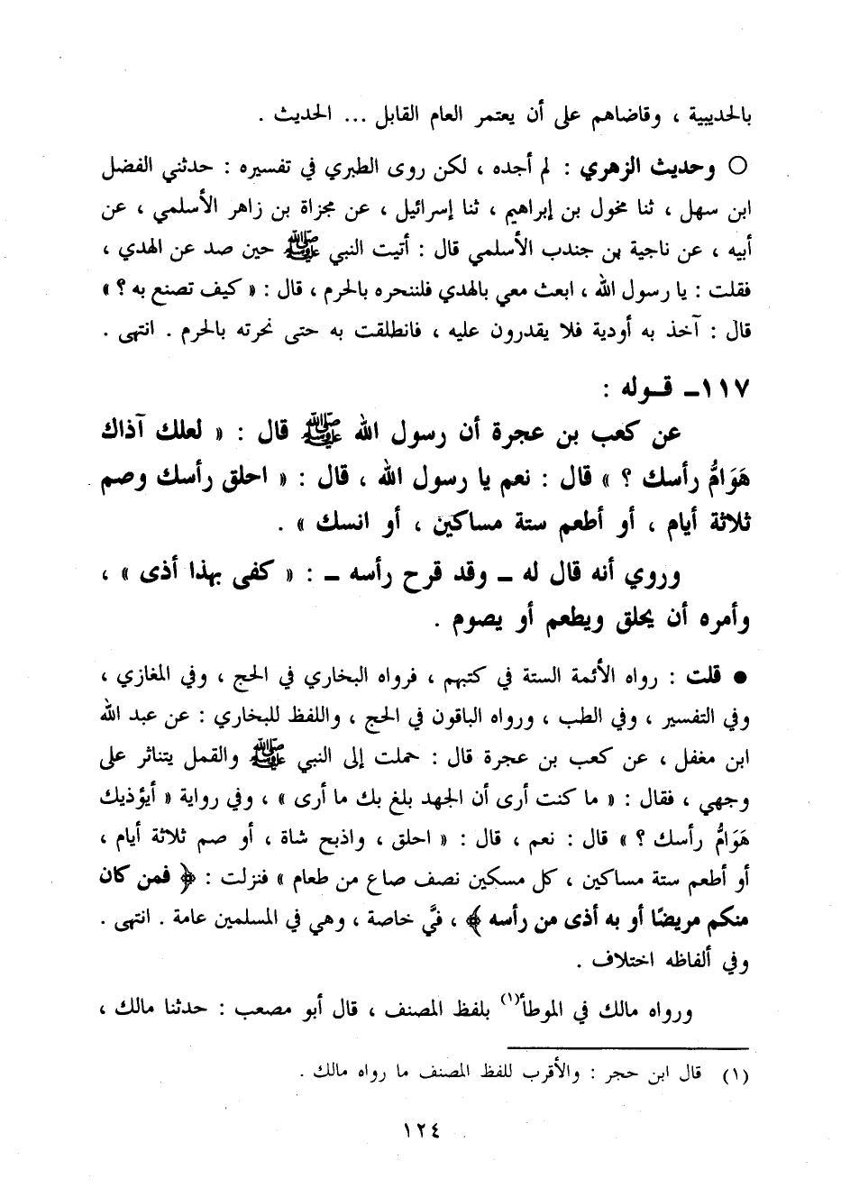 قلت رَوَاهُ الْأَئِمَّة السِّتَّة فِي كتبهمْ فَرَوَاهُ البُخَارِيّ فِي الْحَج وَفِي الْمَغَازِي وَفِي التَّفْسِير وَفِي الطِّبّ وَرَوَاهُ الْبَاقُونَ فِي الْحَج وَاللَّفْظ للْبُخَارِيّ عَن عبد الله ابْن مُغفل عَن كَعْب بن عجْرَة قَالَ حملت إِلَى النَّبِي صَلَّى اللَّهُ عَلَيْهِ وَسَلَّم َ وَالْقمل يَتَنَاثَر عَلَى وَجْهي فَقَالَ مَا كنت أرَى أَن الْجهد بلغ بك مَا أرَى وَفِي رِوَايَة أَيُؤْذِيك هوَام رَأسك قَالَ نعم قَالَ احْلق وَاذْبَحْ شَاة أَو صم ثَلَاثَة أَيَّام أَو أطْعم سِتَّة مَسَاكِين كل مِسْكين نصف صَاع من طَعَام فَنزلت فَمن كَانَ مِنْكُم مَرِيضا أَو بِهِ أَذَى من رَأسه فِي خَاصَّة وَهِي فِي الْمُسلمين عَامَّة انْتَهَى وَفِي أَلْفَاظه اخْتِلَاف