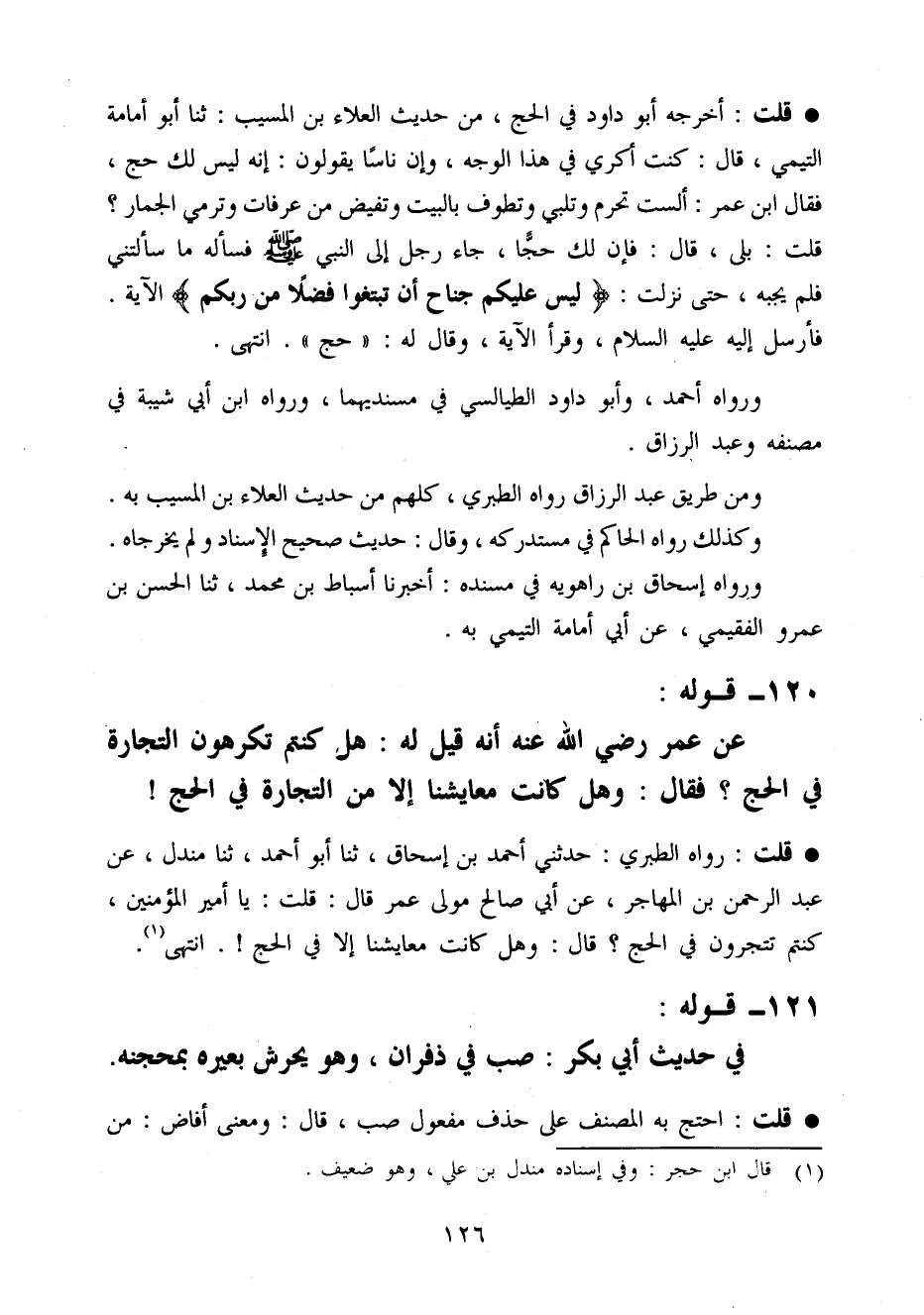 قلت رَوَاهُ الطَّبَرِيّ حَدثنِي أَحْمد بن إِسْحَاق ثَنَا أَبُو أَحْمد ثَنَا منْدَل عَن عبد الرَّحْمَن بن المُهَاجر عَن أبي صَالح مولَى عمر قَالَ قلت يَا أَمِير الْمُؤمنِينَ كُنْتُم تَتَّجِرُونَ فِي الْحَج قَالَ وَهل كَانَت مَعَايِشنَا إِلَّا فِي الْحَج انْتَهَى