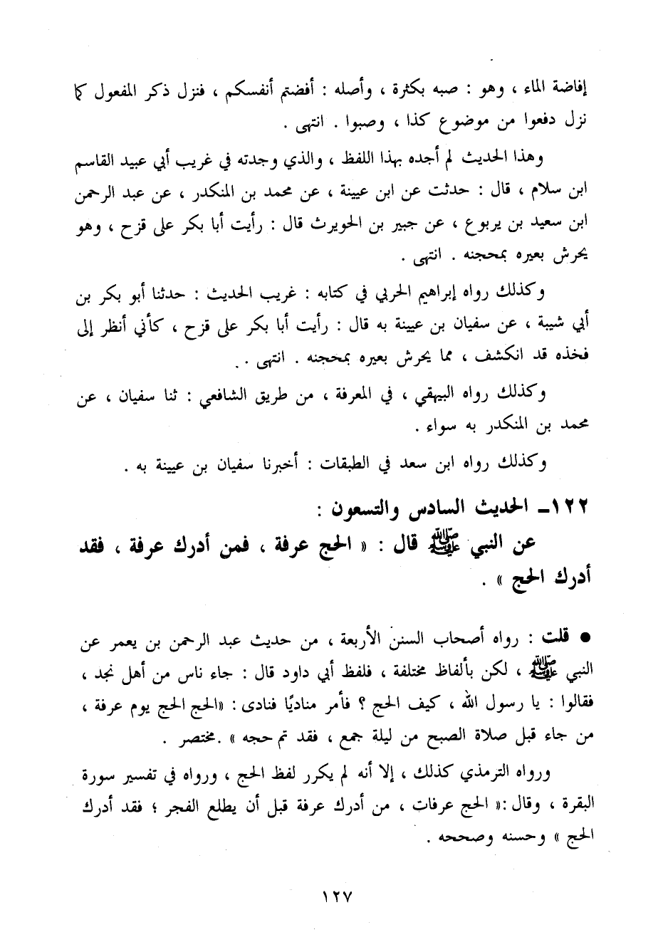قلت رَوَاهُ أَصْحَاب السّنَن الْأَرْبَعَة من حَدِيث عبد الرَّحْمَن بن يعمر عَن النَّبِي صَلَّى اللَّهُ عَلَيْهِ وَسَلَّم َ لَكِن بِأَلْفَاظ مُخْتَلفه فَلفظ أبي دَاوُد قَالَ جَاءَ نَاس من أهل نجد فَقَالُوا يَا رَسُول الله كَيفَ الْحَج فَأمر مناديا فَنَادَى الْحَج الْحَج يَوْم عَرَفَة من جَاءَ قبل صَلَاة الصُّبْح من لَيْلَة جمع فقد تمّ حجه مُخْتَصر