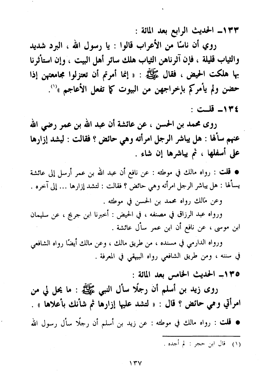 رَوَى زيد بن أسلم أَن رجلا سَأَلَ النَّبِي صَلَّى اللَّهُ عَلَيْهِ وَسَلَّم َ مَا يحل لي من امْرَأَتي وَهِي حَائِض قَالَ لِتشد عَلَيْهَا إزَارهَا ثمَّ شَأْنك بِأَعْلَاهَا
