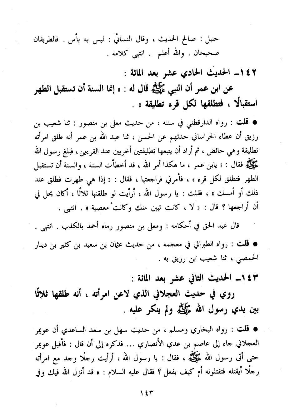 143 - الحَدِيث الثَّانِي عشر بعد الْمِائَة رُوِيَ فِي حَدِيث الْعجْلَاني الَّذِي لَاعن امْرَأَته أَنه طَلقهَا ثَلَاثًا بَين يَدي رَسُول الله صَلَّى اللَّهُ عَلَيْهِ وَسَلَّم َ وَلم يُنكر عَلَيْهِ