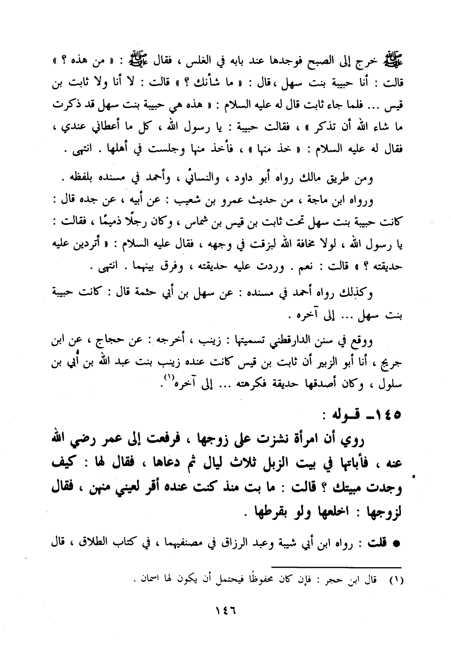 صَلَّى اللَّهُ عَلَيْهِ وَسَلَّم َ خرج إِلَى الصُّبْح فَوَجَدَهَا عِنْد بَابه فِي الْغَلَس فَقَالَ صَلَّى اللَّهُ عَلَيْهِ وَسَلَّم َ من هَذِه قَالَت أَنا حَبِيبَة بنت سهل قَالَ مَا شَأْنك قَالَت لَا أَنا وَلَا ثَابت بن قيس ... فَلَمَّا جَاءَ ثَابت قَالَ لَهُ عَلَيْهِ السَّلَام هَذِه هِيَ حَبِيبَة بنت سهل قد ذكرت مَا شَاءَ الله أَن تذكر فَقَالَت حَبِيبَة يَا رَسُول الله كل مَا أَعْطَانِي عِنْدِي فَقَالَ لَهُ عَلَيْهِ السَّلَام خُذ مِنْهَا فَأخذ مِنْهَا وَجَلَست فِي أَهلهَا انْتَهَى