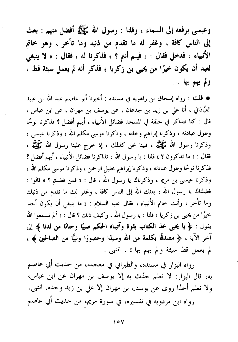 قلت رَوَاهُ إِسْحَاق بن رَاهَوَيْه فِي مُسْنده أخبرنَا أَبُو عَاصِم عبد الله بن عبيد الْعَبادَانِي أَنا عَلّي بن زيد بن جدعَان عَن يُوسُف بن مهْرَان عَن ابْن عَبَّاس قَالَ كُنَّا نتذاكر فِي حَلقَة فِي الْمَسْجِد فَضَائِل الْأَنْبِيَاء أَيهمْ أفضل فَذَكرنَا نوحًا وَطول عِبَادَته وَذكرنَا إِبْرَاهِيم وَخلته وَذكرنَا مُوسَى مُكَلم الله وَذكرنَا عِيسَى وَذكرنَا رَسُول الله صَلَّى اللَّهُ عَلَيْهِ وَسَلَّم َ فَبينا نَحن كَذَلِك إِذْ خرج علينا رَسُول الله صَلَّى اللَّهُ عَلَيْهِ وَسَلَّم َ فَقَالَ مَا تذكرُونَ قُلْنَا يَا رَسُول الله تَذَاكرنَا فَضَائِل الْأَنْبِيَاء أَيهمْ أفضل فَذَكرنَا نوحًا وَطول عِبَادَته وَذكرنَا إِبْرَاهِيم خَلِيل الرَّحْمَن وَذكرنَا مُوسَى مُكَلم الله وَذكرنَا عِيسَى بن مَرْيَم وَذَكَرْنَاك يَا رَسُول الله قَالَ فَمن فضلْتُمْ قَالُوا فضلناك يَا رَسُول الله بَعثك الله إِلَى النَّاس كَافَّة وَغفر لَك مَا تقدم من ذَنْبك وَمَا تَأَخّر وَأَنت خَاتم الْأَنْبِيَاء فَقَالَ عَلَيْهِ السَّلَام مَا يَنْبَغِي أَن يكون أحد خيرا من يَحْيَى بن زَكَرِيَّا قُلْنَا يَا رَسُول الله وَكَيف ذَلِك قَالَ ألم تسمعوا الله يَقُول يَا يَحْيَى خُذ الْكتاب بِقُوَّة وَآتَيْنَاهُ الحكم صَبيا وَحَنَانًا من لدنا إِلَى آخر الْآيَة مُصدقا بِكَلِمَة من الله وَسَيِّدًا وَحَصُورًا وَنَبِيًّا من الصَّالِحين لم يعْمل قطّ سَيِّئَة وَلم يهم بهَا انْتَهَى